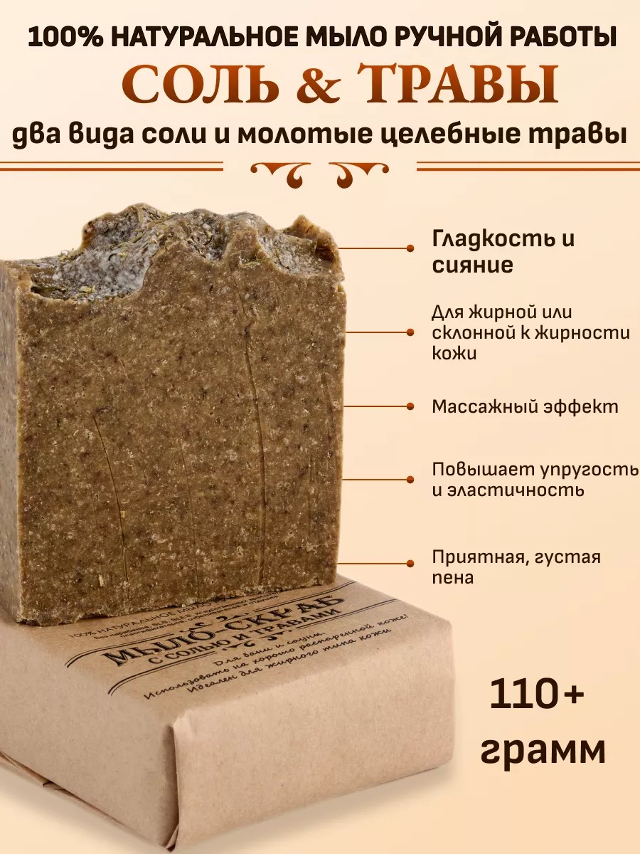 We add ground medicinal herbs, collected in fields far from roads and cities, and two types of salt (sea and pink Himalayan) containing dozens of microelements that nourish the skin to this handmade soap scrub.