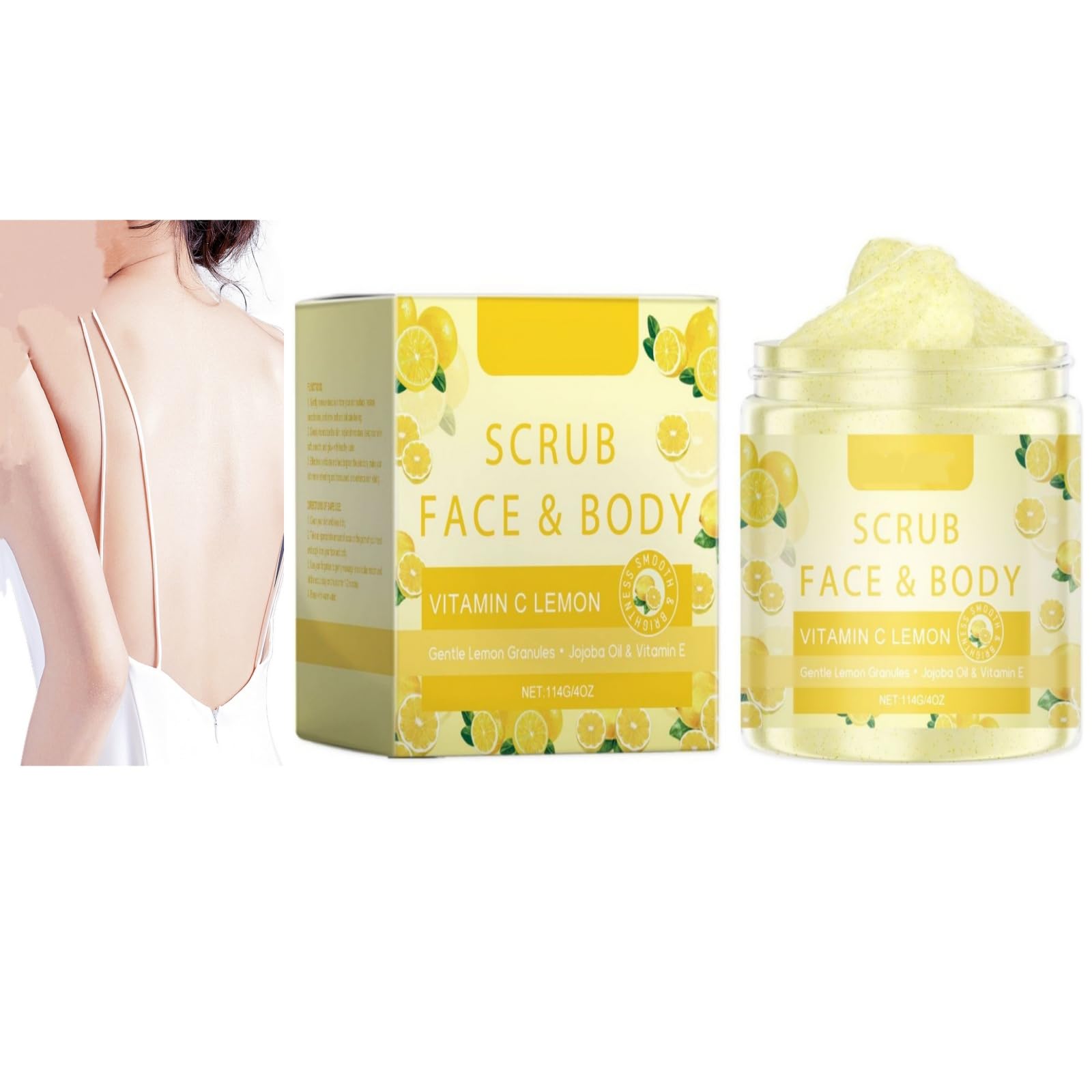 Lemon Vitamin C Face and Body Scrub - Gentle Exfoliating Scrub with Jojoba Oil - Brightening and Moisturizing - Deep Cleansing - For Silky-Smooth Skin - Reduces Dead and Dry Skin for a Soft and Hydrated Feel - This lemon vitamin C face and body scrub exfoliates for visibly smoother and brighter skin. This scrub, with natural lemon granules, vitamin C, and jojoba oil, transforms dull, dry skin into soft, supple skin. Specifications: Item Name: Scrub Net Weight: 114g Package Contents: 1 2 4 6 pieces: Scrub NOTE: 1. Please allow 1-2 ml error due to manual measurement. 2. Due to lighting effects during photography and different screen settings, the colors of the product in the image may differ slightly from the color of the delivered product. Thank you for your understanding. After-sales service: If you encounter any problems while purchg and using our products, please contact us promptly. SAFETY WARNING Please place it in a well-ventilated, dry, and sunny environment and store it out of reach of children. Avoid contact with eyes or damaged skin and ensure it is used during use.Visible results: Targets dryness, cracks, and uneven texture, revealing skin that feels smooth and healthy. Refreshing sensation: The burst of lemon enhances the skincare experience, while the non-sticky formula ensures comfort after application. Deep hydration: Jojoba oil penetrates deeply to hydrate and retain moisture, keeping skin soft and supple long after application. Brightening vitamin C: Blurs dullness and evens skin tone, promoting a healthy, luminous glow when used consistently. Gentle exfoliation: Lemon granules gently remove dead skin cells and impurities and improve texture without irritation, perfect for both face and body.Exfoliant pour le visage et le corps à la vitamine C au citron - Exfoliant doux à l'huile de jojoba, éclaircissant et hydratant, nettoyant en profondeur, pour une peau lisse et soyeuse, réduit les 1 pièce.DESCRIPTION DU PRODUIT DESCRIPTION DU PRODUIT Exfoliant visage et corps à la vitamine C au citron - Exfoliant doux à l'huile de jojoba - Éclaircissant et hydratant - Nettoie en profondeur - Pour une peau lisse et soyeuse - Réduit les peaux mortes et sèches pour une sensation douce et hydratée - Le produit avec le gommage visage et corps à la vitamine C citron exfolie pour une peau visiblement plus lisse et plus claire. Ce gommage aux granulés naturels de citron, à la vitamine C et à l'huile de jojoba transforme la peau terne et sèche en une peau douce. Spécifications: Nom de l'article : gommage Poids net : 114 g. Contenu du colis : 1 2 4 6 pièces : frotter. REMARQUE: 1. Les mesures étant prises à la main, les tailles indiquées peuvent varier de 1 à 2 ml. 2. En raison des effets de l'éclairage pendant la prise de vue et des différents réglages de l'écran, les couleurs du produit sur l'image peuvent différer légèrement de la couleur du produit livré. Merci de votre compréhension. Service après-vente : Si vous rencontrez des problèmes lors de l'achat et de l'utilisation de nos produits, veuillez nous contacter à temps. AVERTISSEMENT DE SÉCURITÉ Veuillez le placer dans un environnement ventilé, sec et ensoleillé et le ranger dans un endroit qui n'est pas facile pour les enfants à atteindre. Évitez tout contact avec les yeux ou la peau endommagée et assurez-vous qu'il est utilisé durinRésultats visibles : cible la sécheresse, les fissures et la texture inégale, révélant une peau lisse au toucher et en bonne santé. Sensation rafraîchissante : la montée au citron améliore l'expérience de soins de la peau, tandis que la formule non adhésive assure un confort après l'application. Hydratation en profondeur : l'huile de jojoba pénètre en profondeur pour hydrater et retenir, gardant la peau douce et souple longtemps après l'application. Vitamine C éclaircissante : estompe la matité et uniformise le son, favorisant une lueur saine et lumineuse lorsqu'elle est utilisée de manière cohérente. Gommage doux : les granulés de citron éliminent en douceur les cellules mortes de la peau et les impuretés et améliorent la texture sans irritation, parfait pour le visage et le corps.