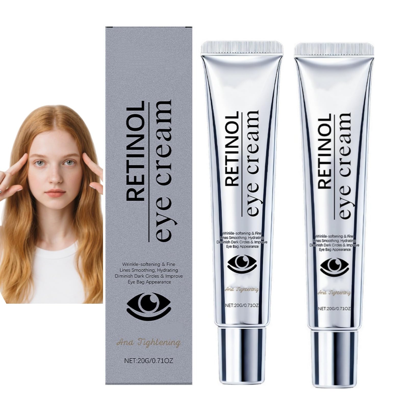 20 g Retinol eye cream is designed for gentle daily care under the eyes: Deep Hydration: Hydrates the eyes to reduce dryness, firmness and rough texture and soften the skin. Relieves dullness: relieves tired eyes and gives the eye contour a natural glow. Light formula: non-greasy texture is quickly absorbed, applies in the morning or evening without feeling heavy. Gentle use: The soft texture is easy to apply, perfect for daily under-eye care. Specifications: Item name: eye cream Net weight: Package includes: 20g. 2 4 6 8 pieces: eye cream. Note: 1st Please allow 1-2g difference due to manual measurement. 2nd Due to the different display settings and lighting effect, the picture may not reflect the actual color of the item. Thank you for your understanding. WARNING Adults Only: This product is intended for adults not suitable for children or adolescents. Avoid contact with the ocular mucosa: if the cream comes into contact with the eyes, rinse thoroughly with clean water. If irritation persists, consult a doctor. For external use only: do not ingest keep out of the reach of children. SAFETY WARNING noneOnly for adults, safe use: This retinol eye cream is only intended for adults. Avoid contact with the ocular mucosa In case of accidental contact, rinse immediately with water. Daily gentle care: the smooth texture matches the daily care under the eyes and keeps the area around the eyes pleasant. Light and non-greasy: the refreshing formula is easily absorbed and does not feel heavy or greasy after application. Enhances Under-Eye Glow: Lightens dullness around the eyes and leaves the eye contour looking bright and refreshed. Long-lasting hydration: hydrates eyes to reduce dryness, tightness and discomfort and achieve a soft touch.Retinol Oogcrème, 20 g, hydraterende oogverzorging voor volwassenen, kalmeert droogheid, verstevigt, verstevigt en gladder de huid van de ogen, vermindert fijne lijntjes (2 stuks) 20 g Retinol oogcrème is ontworpen voor een zachte dagelijkse verzorging onder de ogen: Diepe hydratatie: hydrateert de ogen om droogheid, stevigheid en ruwe textuur te verminderen en de huid zacht te maken. Verlicht de matheid: verlicht vermoeide ogen en geeft de oogcontour een natuurlijke glans. Lichte formule: niet-vettige textuur trekt snel in, past zich 's ochtends of' s avonds aan zonder zwaar aan te voelen. Zacht gebruik: de zachte textuur is gemakkelijk aan te brengen, perfect voor dagelijkse verzorging onder de ogen. Specificaties: Artikelnaam: oogcrème Nettogewicht: Pakket bevat: 20 g. 2 4 6 8 stuks: oogcrème. Opmerking: 1ste Houd rekening met een verschil van 1-2 g vanwege handmatige meting. 2de Vanwege de verschillende beeldscherminstellingen en het lichteffect kan het zijn dat de afbeelding de werkelijke kleur van het artikel niet weergeeft. Bedankt voor je begrip. WAARSCHUWING Alleen volwassenen: Dit product is bedoeld voor volwassenen niet geschikt voor kinderen of adolescenten. Vermijd contact met het oogslijmvlies: als de crème in de ogen komt, spoel dan grondig af met schoon water. Bij aanhoudende irritatie een arts raadplegen. Alleen voor uitwendig gebruik: niet innemen buiten het bereik van kinderen bewaren. VEILIGHEIDSWAARSCHUWING geenAlleen voor volwassenen, veilig gebruik: deze retinol oogcrème is alleen bedoeld voor volwassenen. Vermijd contact met het oogslijmvlies bij onbedoeld contact onmiddellijk met water uitspoelen. Dagelijkse zachte verzorging: de gladde textuur past bij de dagelijkse verzorging onder de ogen en houdt het gebied rond de ogen aangenaam. Licht en niet vetend: de verfrissende formule trekt gemakkelijk in en voelt na het aanbrengen niet zwaar of vettig aan. Verbetert de gloed onder de ogen: verlicht dofheid rond de ogen en laat de oogcontour er helder en verfrist uitzien. Langdurige hydratatie: hydrateert de ogen om droogheid, strak gevoel en ongemak te verminderen en een zachte aanraking te bereiken.