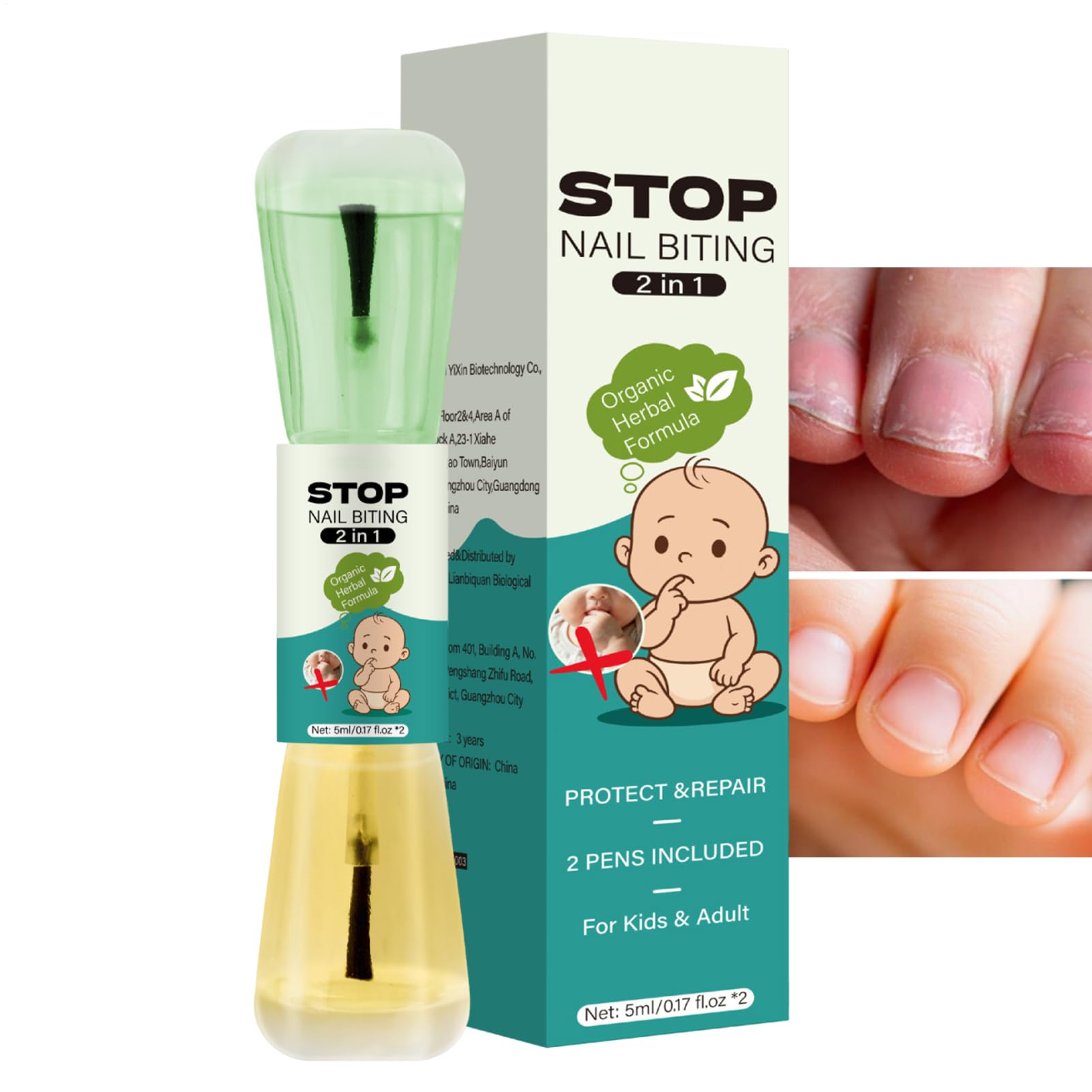 No Bite Nail Polish for toddlers and adults provides a reliable solution for correcting bad habits by preventing the urge to put fingers in the mouth. Designed for all ages, this nourishing formula offers all-day protection, promoting healthier hand habits for boys, girls, women, and teens. Whether at home, school, preschool, in a dorm, or while traveling, it serves as a convenient aid for breaking unwanted behaviors while providing comfort and care. The polish is carefully formulated to support individuals seeking a reliable option for habit correction without compromising safety or usability. Ideal for everyday use, it fits seamlessly into various environments, making it a versatile choice for anyone looking to encourage better habits naturally. Specification Product Name: No Bite Nail Polish Product Size: Approximately 2.1 x 2.1 x 9.5 cm 0.83 x 0.83 x 3.74 inches Product Weight: Approximately 30 g Package Contents: 1 x 5 ml Anti-Bite Nail Polish 1 x 5 ml Nail Repair Polish Note: Due to different lighting and screen settings, the item's color may be slightly different from the picture. Due to different manual measurements, please allow a 1-2 cm size difference. SAFETY WARNING Not applicableAnti-Nail Biting Innovation: Designed with a fast-absorbing texture, this anti-nail biting polish simplifies your daily routine by offering benefits for all ages without the need for additional tools, helping to maintain well-groomed nails during various activities. The quick and easy-to-use formula supports a simple care habit to break the habit of nail biting at home or on the go, thanks to its direct application and absorption. Easy Habit Management: With its compact and portable design, this anti-nail biting polish allows for effortless habit control, even while traveling. The travel-friendly size ensures easy storage and transport, promoting regular application in all situations, whether at home, in the office, or while traveling. The anti-nail biting polish supports discreet habit management, with portability that enhances usability. Safe Habit Breaker: Formulated with plant extracts, this nail-biting stop polish offers a gentle approach to preventing this habit, making it suitable for daily use without damaging the skin. It allows you to effortlessly maintain clean and well-groomed hands, with a safe formula suitable for frequent application for continuous and discreet prevention. All-Day Protection: The anti-biting nail polish provides reliable deterrent thanks to its flavorful composition, helping to break unwanted habits like nail biting. It ensures all-day protection with a durable coating that works perfectly in all settings, whether at home, in the office, or on the go. This constant protection helps overcome moments of temptation and solidify progress in quitting. Promotes Nail Health: This anti-biting polish protects the edges of nails and supports overall health with a nourishing, deeply moisturizing blend. It is suitable for daily use at home or on the go, improving the health of nails and strengthening their structure for visible results, without irritating delicate skin.ZHUMCCY Vernis Anti-Morsure d'Ongles Pour Tout-Petits,Empêcher De Mettre Les Doigts À La Bouche - Vernis À Ongles Réparateur Pour Pour Maison Dortoir École Maternelle Garçons Filles FemmesDESCRIPTION DU PRODUIT DESCRIPTION DU PRODUIT Le vernis à ongles No Bite pour tout-petits et adultes fournit une solution fiable pour corriger les mauvaises habitudes en prévenant l'envie de porter les doigts à la bouche. Conçu pour les âges, ce mélange nourrissant offre une protection toute la journée, favorisant des habitudes manuelles plus saines pour les garçons, filles, femmes et adolescents. Que ce soit à la maison, à l'école, à la maternelle, en dortoir ou pendant les voyages, il sert d'aide pratique pour briser les comportements indésirables tout en offrant confort et soin. Le vernis est conçu avec soin pour soutenir les individus cherchant une option fiable pour la correction des habitudes sans compromettre la sécurité ou l'utilisabilité. Idéal pour une utilisation quotidienne, il s'intègre parfaitement dans divers environnements, en faisant un choix polyvalent pour quiconque souhaite encourager de meilleures habitudes de manière naturelle et . Spécification Nom du produit : vernis à ongles anti-rongements. Taille du produit: environ 2,1x2,1x9,5 cm 0,83x0,83x3,74 pouces Poids du produit : environ 30 g Liste de colisage : 1 pièce 5 ml de vernis anti-morsure des ongles 1 pièce 5 ml de vernis de réparation pour ongles Remarque : En raison des différents paramètres d'éclairage et d'écran, la couleur de l'article peut être légèrement différente de celle de l'image. En raison des différentes mesures manuelles, veuillez prévoir une différence de taille de 1 à 2 cm. AVERTISSEMENT DE SÉCURITÉ N'est pas applicableInnovation Anti-Rongeage : Conçu avec une texture à absorption rapide, ce vernis anti-rongeage d'ongles facilite la routine quotidienne en offrant des avantages pour les âges sans nécessiter d'outils supplémentaires, aidant à maintenir des ongles bien soignés lors de diverses activités. La formule rapide et inclusive soutient une habitude de soin simple pour briser ment la manie de se ronger les ongles à la maison ou en déplacement, grâce à son application directe et son absorption. Gestion Facile des Habitudes: Grâce à son design compact et portable, ce vernis anti-morsure d'ongles permet de contrôler ses habitudes sans effort, même en déplacement. La taille adaptée aux voyages assure un rangement et un transport aisés, favorisant une application régulière dans toutes les situations, que ce soit à la maison, au bureau ou en voyage. Le vernis anti-morsure d'ongles soutient une gestion des habitudes discrète et , avec une portabilité qui améliore l'utilisat. Brise-Habitude Sécure: Conçu à base d'extraits végétaux, ce vernis pour arrêter de mordre les