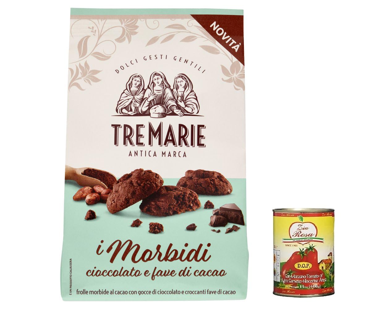 Lot de 12 biscuits Tre marie i morbidi cioccolato e fave di cacao, chocolat et fèves de cacao 300 g boîte Zia Rosa DOP Pomodoro San Marzano de 400 g