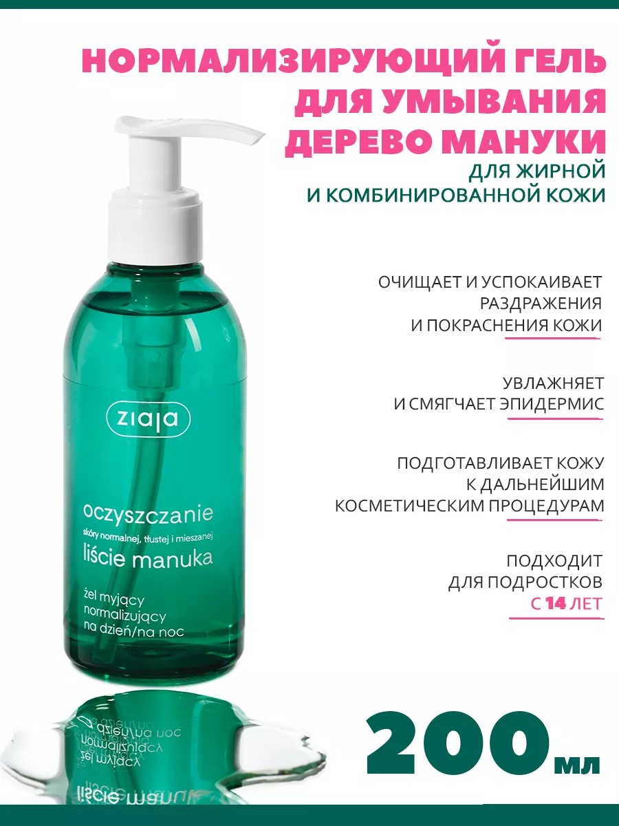 Очищающий нормализующий гель для умывания "Листья Мануки" Ziaja для жирной и комбинированной Не содержит мыла. Восстанавливает естественный баланс и свежесть кожи. Активные вещества глубокого очищения:- Экстракт листьев мануки с антибактериальными свойствами,- вяжущее и нормализующее Zinc Coceth Sulfat,- увлажняющие и успокаивающие активные вещества,- лактобионовая кислота, аллантоин и провитамин B5.- Гель состоит из натуральных компонентов ,за счет чего оказывает очень бережное воздействие на кожу. Средство от прыщей, акне, покраснений, от расширенных пор Гель для умывания с экстрактом листьев мануки Ziaja увлажняет и тонизирует кожу. Подходит для всех типов кожи.. Не содержит парабенов, красителей и отдушек. Содержит экстракт листьев мануки, который увлажняет и успокаивает кожу. Нанесите небольшое количество геля на лицо, вспеньте и смойте водой. Подготавливает кожу к дальнейшим косметическим процедурам. Используйте утром и или вечером перед нанесением макияжа или после него.