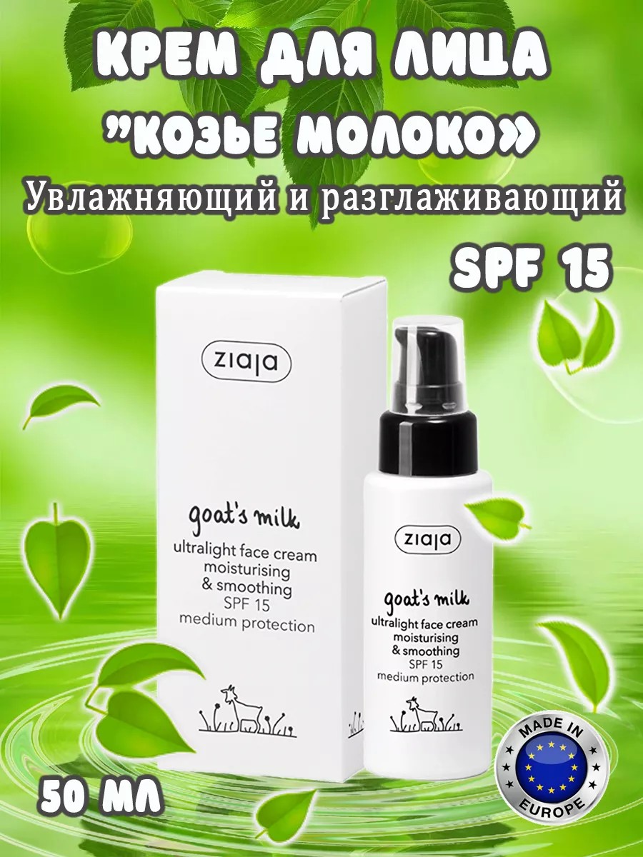 Шагни к ежедневному ритуалу красоты с убедительным уходом для лица при помощи профессионального крема, созданного специально для достижения великолепных результатов. Наслаждайся моментом, когда ты заботишься о себе и подари своей коже самый лучший уход с помощью этого невероятного крема для лица "Козье молоко. Увлажняющий и разглаживающий" SPF 15 (50 мл) от Ziaja из Польши. Женщинам и мужчинам, которые ценят натуральность, крем для лица от Ziaja Goat's milk - это настоящее открытие. Он нежно и эффективно ухаживает за кожей лица, не перегружая ее и не вызывая раздражения. Ультралегкий крем обладает увлажняющим и разглаживающим эффектом, при этом не оставляет ощущения жирности. Такое средство подарит тебе питательный уход, который превзойдет все ожидания. Изысканная формула, разработанная для удовлетворения самых требовательных клиентов, обеспечивает органическую косметику с натуральными ингредиентами. Крем восстанавливает и увлажняет кожу, способствует росту здоровых клеток, успокаивает и укрепляет ее. Он станет идеальным подарком для тех, кто ценит натуральный уходовый косметический продукт. Результаты не заставят себя ждать, и ты почувствуешь, как твоя кожа станет более увлажненной, гладкой и молодой. Крем заботится о красоте и здоровье твоей кожи, разглаживая морщины, антивозрастные изменения, а также стимулируя естественный рост клеток и предотвращая появление растяжек. Удобный флакон с дозатором позволит тебе использовать необходимое количество крема, чтобы получить максимальное удовольствие от его использования. Почувствуй на себе оригинальность профессионального ухода, и ты не сможешь устоять перед его привлекательностью. Крем для лица от Ziaja – это средство, которое подарит твоей коже увлажнение, восстановление и освежающий эффект. Твоя кожа заслуживает опыт максимального ухода. Закажи прямо сейчас и открой новые горизонты своей красоты!