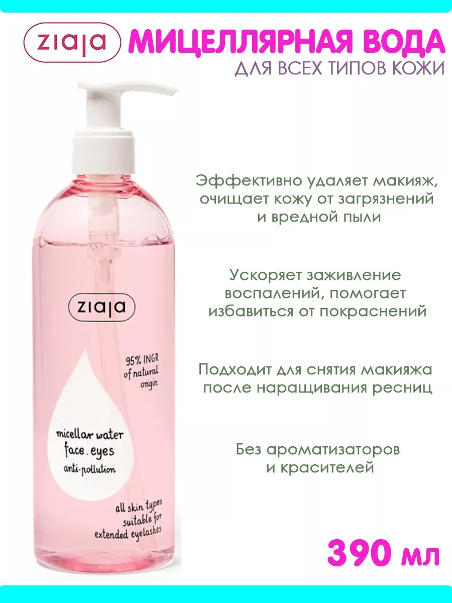 Мицеллярная вода бренда Ziaja — прекрасная и нежная демонстрация того, что удалять декоративную косметику можно с пользой для кожи. Средство не только тщательно удаляет макияж, загрязнения и кожное сало, но и успокаивает, ускоряет заживление воспалений, нормализует работу сальных желез, помогает избавиться от покраснений. Благодаря сбалансированному составу продукт подойдет любому типу эпидермиса, включая склонный к чувствительности. Мицеллярная вода увлажняет и питает кожу, делает ее чистой, мягкой и гладкой. Особенности и преимущества: подходит для всех типов кожи; в составе нет красителей; без запаха; можно использовать для демакияжа после наращивания ресниц; 95% компонентов природного происхождения; справляется даже с водостойкой косметикой; стимулирует кровообращение и обмен веществ; не оставляет стянутости; устраняет излишки себума. Нанести мицеллярную воду на чистую сухую ватную подушку и аккуратно очистить лицо, глаза и губы. При необходимости промыть водой.