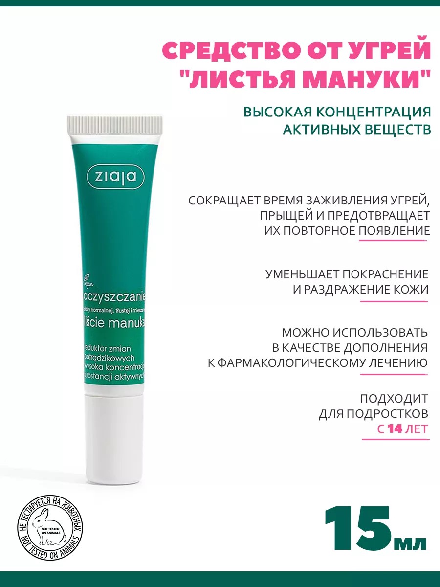 This acne treatment contains ingredients that reduce acne-causing bacteria. This acne cream helps quickly clear up pimples, leaving skin smooth and healthy. Manuka leaf extract has excellent anti-inflammatory, analgesic, and antioxidant properties. Ziaja spot cream for acne and inflammation with manuka leaf extract, 15 ml. This product is original and comes from the official distributor of Ziaja cosmetics in the Republic of Belarus.