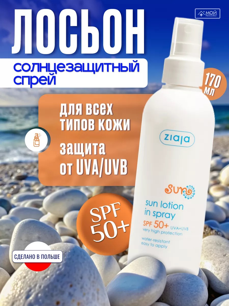 Discover Ziaja's SPF 50 waterproof sunscreen body lotion in a spray. This product provides high protection against all types of UVA and UVB rays, prevents sunburn, and protects against pigmentation changes.