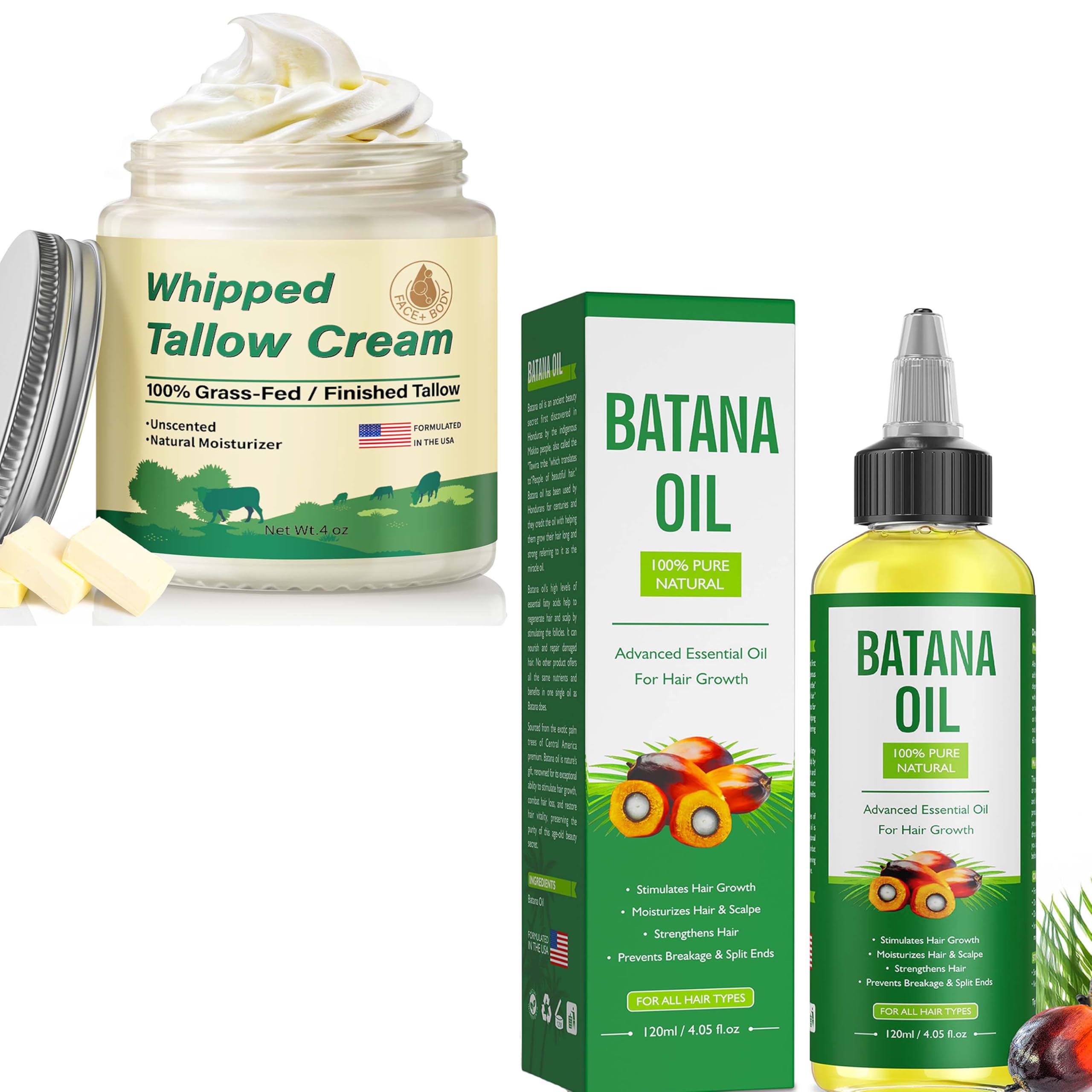 Our products are all made of safe ingredients, providing you with natural care. Batana oil can prevent hair loss, restore damaged hair and scalp, moisturize the scalp, and is suitable for any hair type! Organic Grass Fed Beef Tallow Moisturizer will deeply nourish any dry areas of your body, leaving your skin smooth and soft!ALL-NATURAL INGREDIENTS: Beef tallow for skin contains olive oil, jojoba oil, shea butter, and other organic and natural ingredients, which bring strong moisturization, soothe dryness, repair damaged skin, and restore health and vitality to your skin. DEEP MOISTURIZATION: Our face moisturizer made from grass-fed beef tallow, enriched with vitamins A, K, D, and E deeply nourishes the skin, locking in moisture and increg elasticity and softness, leaving your skin feeling smooth and soft. MOISTURIZES AND REPAIRS: Organic batana oil helps moisturize and soften the hair and scalp, providing deep nourishment, locking in moisture and preventing dryness. It also helps eliminate split ends, leaving your hair smooth, tangle-free and shiny. PROMOTING HAIR GROWTH: Raw batana oil is rich in fatty acids, vitamin E, phytosterols and carotenoids, which can nourish hair, stimulate hair follicles, and promote hair growth. Experience this nutrient-rich oil for thicker, stronger, and healthier hair. PURE AND NATURAL: Our batana oil is extracted from the nuts of the American palm tree from Honduras. Made with organic, natural and unrefined ingredients.Provides pure and healthy care for your hair, as well as all-day protection.