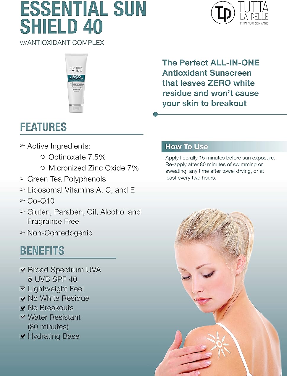 - Broad spectrum UVA/UVB SPF 40 sunscreen