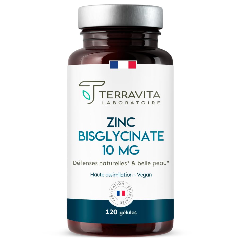 ✓ CUSTOMER SATISFACTION Our patented TRAACS zinc bisglycinate is manufactured in the United States by Albion Minerals Laboratories and then packaged in France. Your satisfaction is our priority. Do not hesitate to contact us, our team of nutritionists and experts will be happy to offer you personalized assistance. Suitable for a vegetarian and vegan diet. WHY 10 MG OF ELEMENTAL ZINC? At Terravita, we are not fans of overdosing. Indeed, many foods already contain varying amounts of zinc. The Reference Value (RV) of 10 mg per day of elemental zinc is not set randomly. A zinc overdose can have serious consequences for the body. Don't be fooled by the race for "always more". WHY TRAACS PATENTED ZINC BISGLYCINATE? Our zinc bisglycinate is produced by our American partner, leader in chelated forms: Albion Minerals. The patented TRAACS manufacturing process guarantees a 100 chelated form with two glycine molecules. This is the big difference with other products from certain Chinese producers, in which we also find the inorganic oxide form, poorly tolerated by the body. WHY THE BISGLYCINATE FORM? There are different forms of zinc on the market: zinc citrate, picolinate, orotate, gluconate… But all studies agree on one thing: zinc bisglycinate is the one with the best bioavailability ( 43.4 compared to gluconate: see study in description) and this without causing digestive disorders. WHY TAKE ZINC SUPPLEMENTS? Zinc is an essential antioxidant trace element in maintaining immunity as well as healthy skin (acne), nails, and hair. However, ? of the French population is thought to be zinc deficient. A diet low in meat and high in cereals and legumes promotes the ingestion of phytates, phosphorus compounds that bind to zinc and greatly limit its assimilation.✓ SATISFACTION CLIENT Notre zinc bisglycinate breveté TRAACS est fabriqué aux Etats-Unis par les laboratoires Albion Minerals puis conditionné en France. Votre satisfaction est notre priorité. N'hésitez-pas à nous contacter, notre équipe de nutritionnistes et d'experts se fera un plaisir de vous offrir une assistance personnalisée. Convient à un régime alimentaire végétarien et vegan. POURQUOI 10 MG DE ZINC ÉLÉMENT ? Chez Terravita, nous ne sommes pas fans des surdosages. En effet, de nombreux aliments contiennent déjà des quantités variables de zinc. La Valeur de Référence (VR) de 10 mg par jour de zinc élément n'est pas fixée au hasard. Un surdosage en zinc peut avoir des conséquences graves pour l'organisme. Ne vous faites pas avoir par la course au "toujours plus". POURQUOI LE ZINC BISGLYCINATE BREVETÉ TRAACS ? Notre zinc bisglycinate est produit chez notre partenaire américain, leader des formes chélatées : Albion Minerals. Le processus de fabrication breveté TRAACS permet de garantir une forme 100 chélatée à deux molécules de glycine. C'est la grosse différence avec les autres produits de certains producteurs chinois, dans lesquels on retrouve aussi la forme inorganique oxyde, mal tolérée par l'organisme. POURQUOI LA FORME BISGLYCINATE ? Il existe différentes formes de zinc sur le marché : zinc citrate, picolinate, orotate, gluconate… Mais toutes les études s'accordent sur une chose : le zinc bisglycinate est celui qui possède la meilleure biodisponibilité ( 43,4 par rapport au gluconate : voir étude en description) et ceci sans causer de troubles digestifs. POURQUOI SE SUPPLÉMENTER EN ZINC ? Le zinc est un oligo-élément antioxydant essentiel dans le maintien de l'immunité ainsi que de la peau (acné), des ongles et des cheveux en bonne santé. Pourtant ? de la population française serait carencée en zinc. Une alimentation pauvre en viande et riche en céréales et légumineuses favorise l'ingestion de phytates, composés phosphorés qui se lient au zinc et limitent grandement son assimilation.