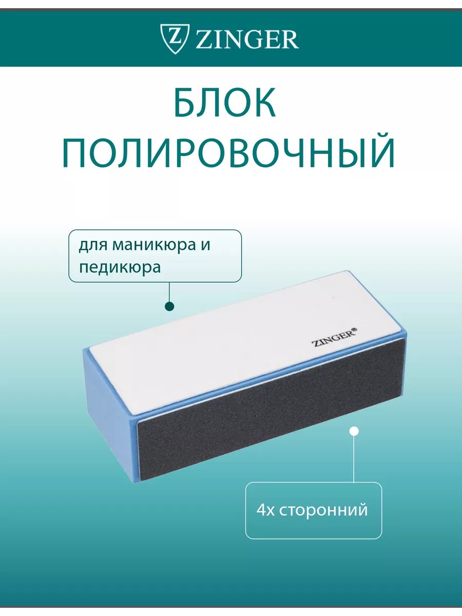 Блок полирующий Zinger 4х сторонний. Разная абразивность полирующих поверхностей обеспечивает идеальный уход за поверхностью ногтей.