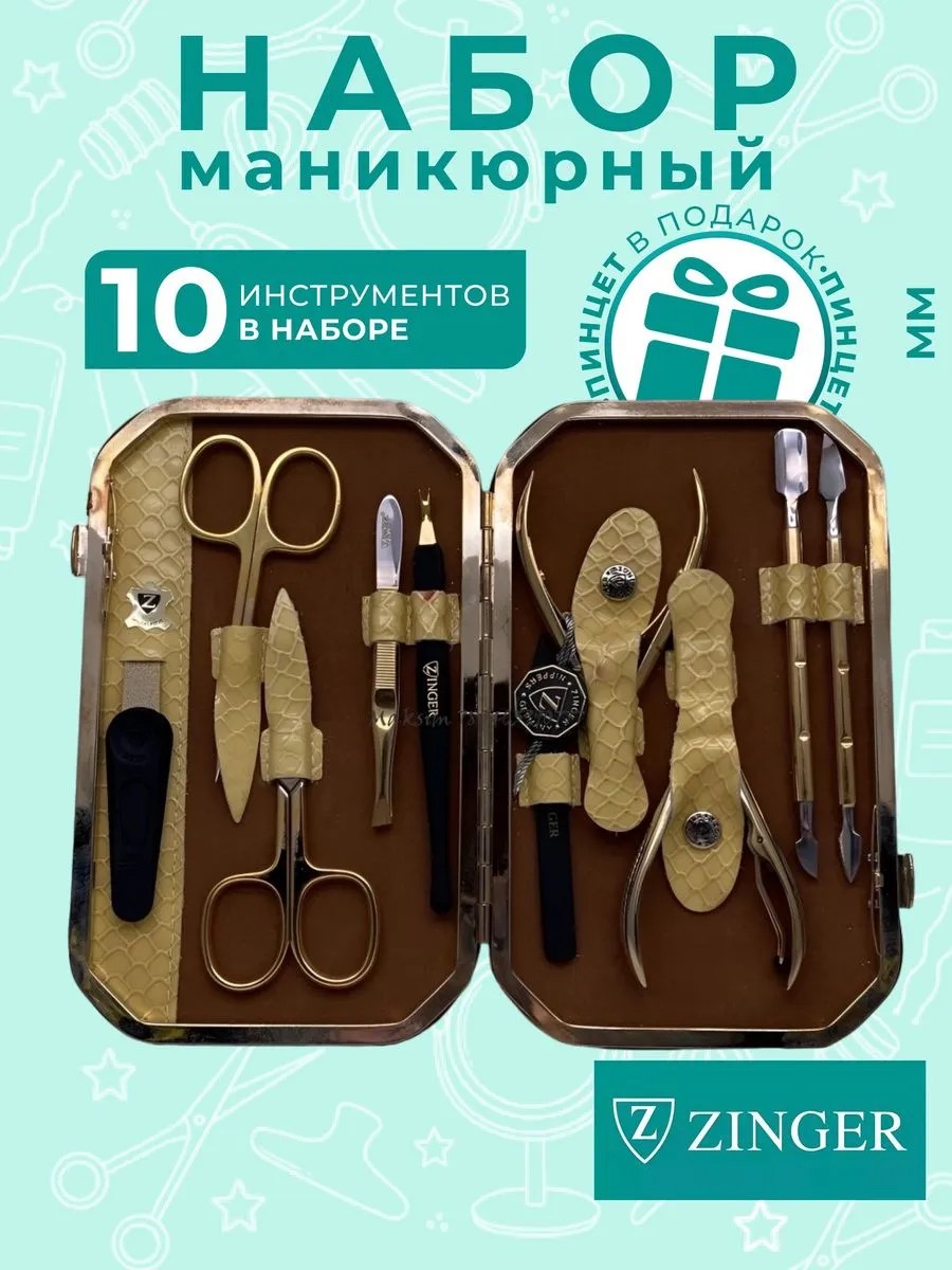 Маникюрный набор в кожаном футляре Zinger - универсальный комплект из 10 инструментов золотистого цвета,предназначенных для профессионального ухода за ногтями и кожей рук и ног.
