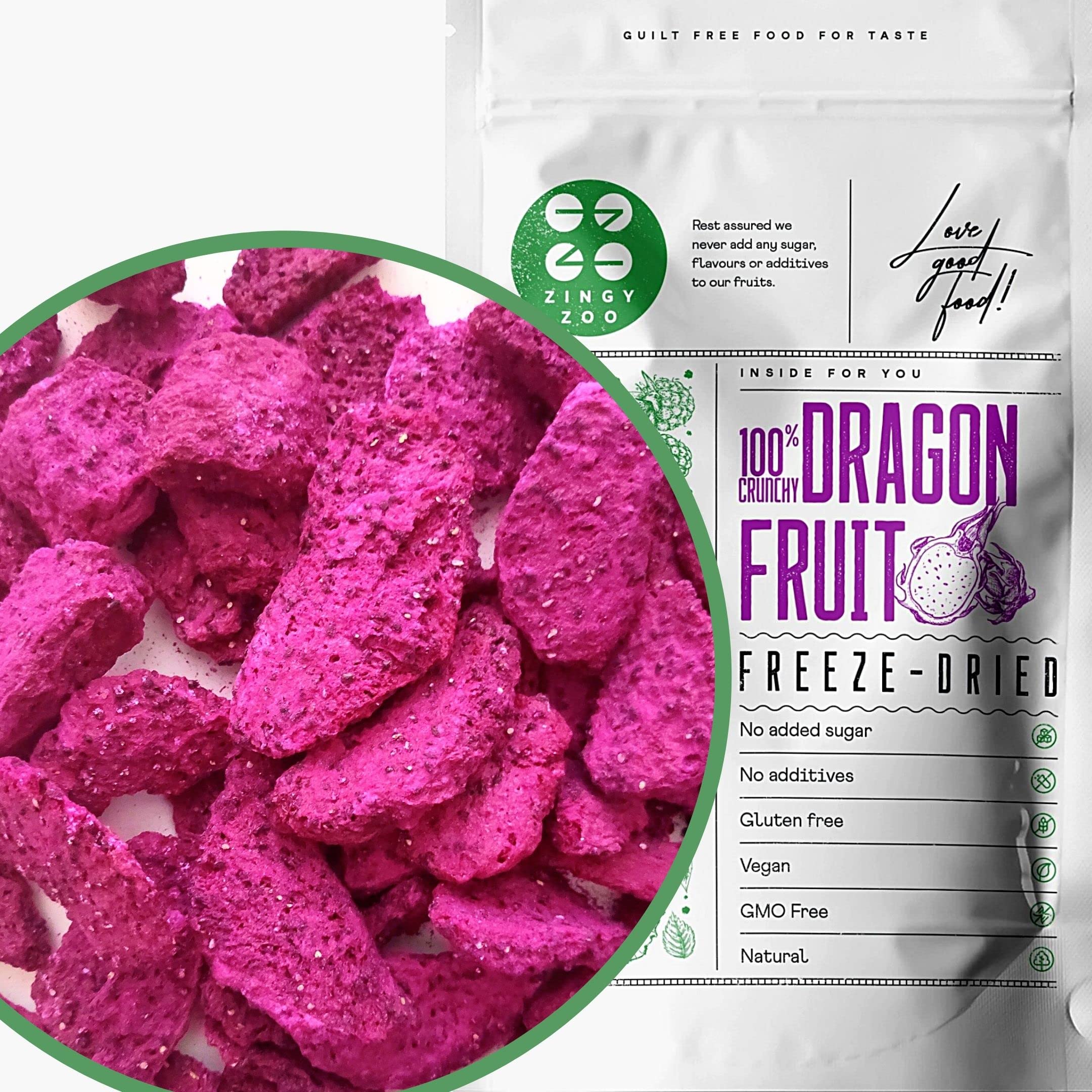 ZingyZoo Morceaux de fruit du dragon rouge lyophilisés, lot de 50 g à emporter de pitaya rouge crue naturelle non sucrée, pour préparer des smoothies ou des collations, colorant alimentaire rose 50g
