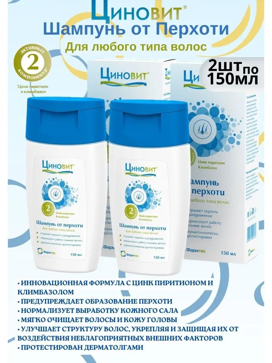 шампунь содержит 2 активных противогрибковых компонента с доказанной клинической эффективностью - цинк пиритион и климбазол. Цинк пиритион обладает доказанным себорегулирующим действием, оказывает противовоспалительное и антибактериальное действие, уменьшая зуд кожи. Цинк пиритион ускоряет процесс отшелушивания отмерших клеток. Мочевина оказывает увлажняющий и мягкий отшелушивающий эффект. Д-пантенол способствует восстановлению кожи головы. Цинк пиритион способствует выработке керамидов (липидов), восстановлению барьерной функции кожи и снижению ее чувствительности к воздействию агрессивных факторов. ШАМПУНЬ Циновит ОТ ПЕРХОТИ устраняет перхоть и раздражение, нормализует работу сальных желез, подходит для волос любого типа, имеет экономичный расход.