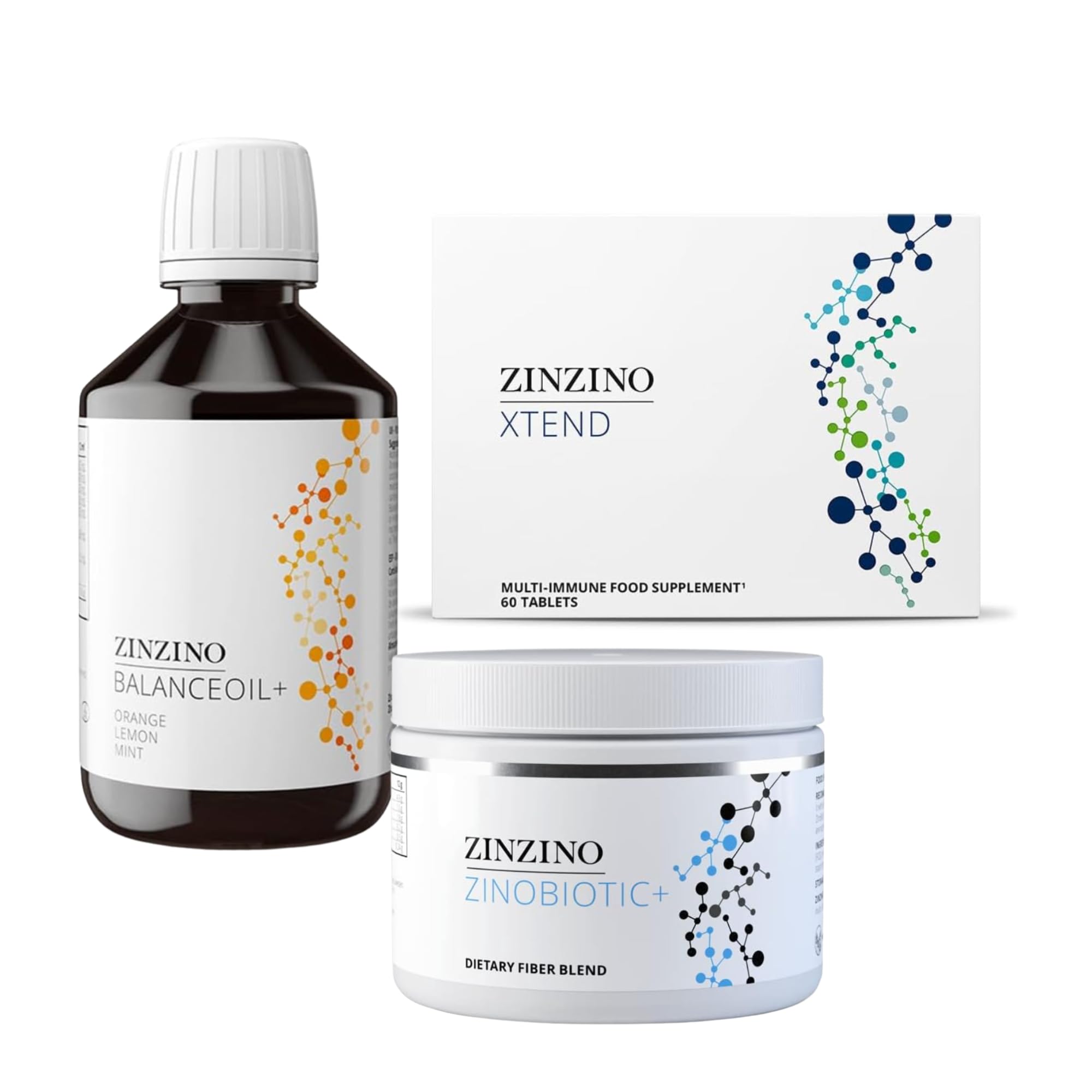 ZinZino Health Protocol Kit Orange-Lemon-Mint A set of 3 premium products including BalanceOil (300 ml) with a natural citrus-mint scent, ZinoBiotic , and Xtend. Perfect for thoughtfully complementing your daily routine. The kit includes: BalanceOil 300 ml, ZinoBiotic , and Xtend. INGREDIENTS Ingredients: Fish oils (obtained from anchovies, mackerel, and sardines), cold-pressed olive oil, tocopherol extracts (antioxidants), natural flavors , vitamin D3 (cholecalciferol). Natural lemon flavor Natural orange, lemon, and mint flavor Natural grapefruit, lemon, and lime flavor Note: BalanceOil , 100 ml, only available in orange, lemon, and mint flavor. Zinobiotic: Resistant maize starch , oat beta-glucans , inulin, oligofructose, resistant potato starch, psyllium. Partially hydrolyzed boluses: guar flour, infused guar, resistant green banana starch. Origin: EU. SAFETY WARNING Food supplements are not a substitute for a balanced and varied diet and a healthy lifestyle. Do not exceed the recommended daily intake. Keep out of reach of children. Store in a cool, dry place away from direct sunlight. See moreScandinavian quality - Complete kit. No artificial additives - Pure formula. Xtend - Complements the daily program. ZinoBiotic - Fiber blend. BalanceOil - Citrus Mint flavor.ZinZino Health Protocol Kit - BalanceOil Orange-Citron-Menthe 300ml ZinoBiotic Xtend - Premium Lot de 3DESCRIPTION DU PRODUIT DESCRIPTION DU PRODUIT ZinZino Health Protocol Kit Orange-Citron-Menthe Lot de 3 produits de qualité supérieure avec BalanceOil (300 ml) au parfum naturel d'agrumes menthe, ZinoBiotic et Xtend. Parfait pour compléter délibérément votre vie quotidienne. Le kit comprend : BalanceOil 300 ml, ZinoBiotic , Xtend. INGRÉDIENTS Ingrédients huiles de poisson (obtenues à base d'anchois, maquereau, sardine), huile d'olive pressée à froid, extraits de tocophérol (antioxydants), arômes naturels , vitamine D3 (cholécalciférol). Arôme naturel de citron Arôme naturel d'orange, citron, menthe Arôme naturel de pamplemousse, citron, citron vert Remarque : BalanceOil , 100 ml, uniquement disponible en arôme orange, citron et menthe Zinobiotic : amidon de maïs résistant , bêta-glucanes d'avoine , inuline, oligofructose, amidon de pomme de terre résistant, psyllium Bols partiellement hydrolytiques farine de guar infusée de guar, amidon résistant de banane verte. Origine : UE. AVERTISSEMENT DE SÉCURITÉ Les compléments alimentaires ne remplacent pas une alimentation équilibrée et variée et un mode de vie sain. Ne pas dépasser la dose journalière recommandée. Tenir hors de portée des enfants. Conserver dans un endroit sec, frais et à l'abri de la lumière directe du soleil. Voir plusQualité scandinave - Kit complet. Sans additifs artificiels - Formule pure. Xtend - Complète le programme quotidien. ZinoBiotic - Mélange de fibres. BalanceOil - Arôme Citrus Menthe.