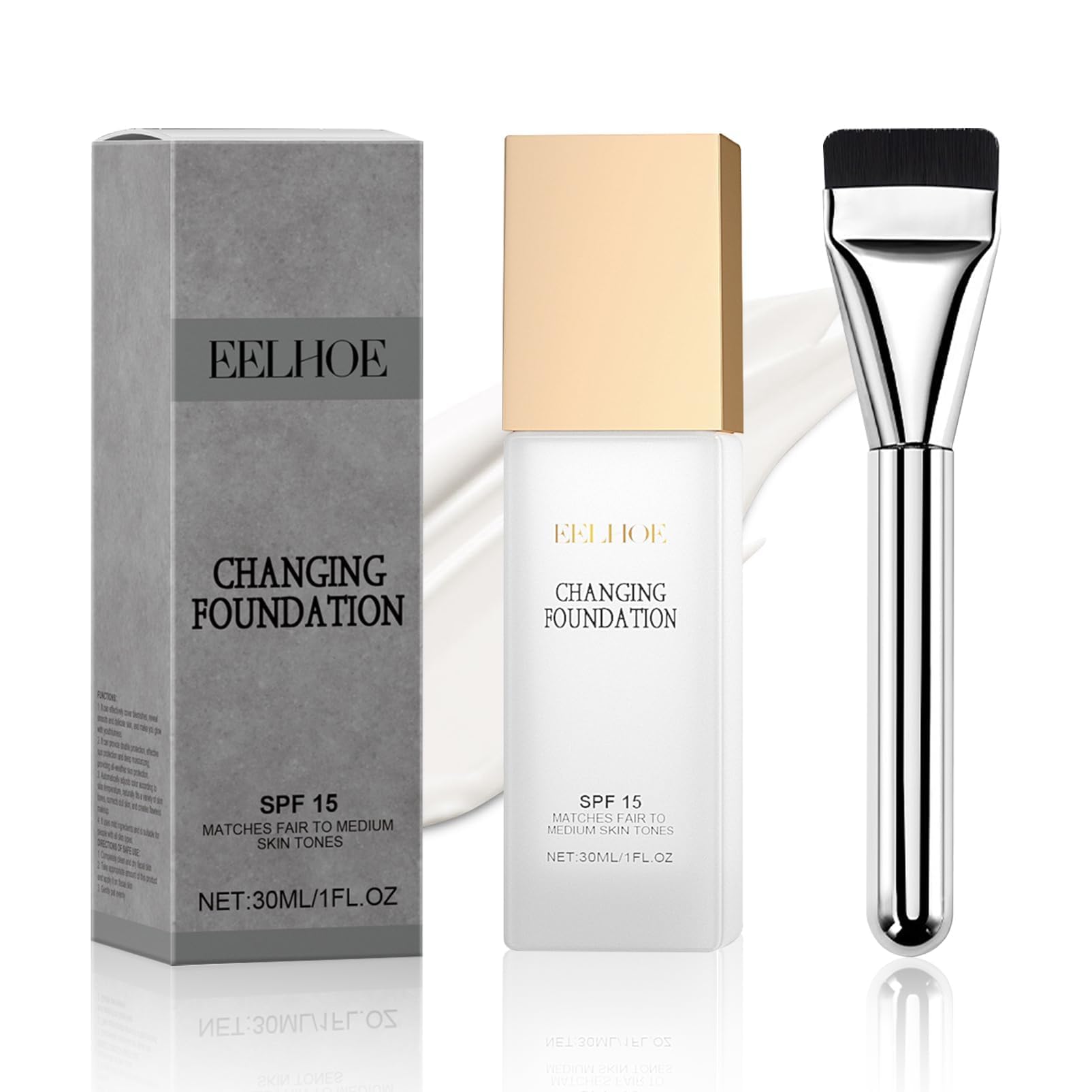 Cream foundation, 30 ml and 1 brush, skin color adjustment, facial makeup foundation INSTRUCTIONS FOR USE shake apply fix SAFETY WARNING none See moreSuitable for all skin types Our color changing foundation is a gentle formula with a light, supple texture and a creamy, fluid consistency, which blends effortlessly without sticking. It effectively camouflages irregularities and provides a light and weightless skin feeling all day long. Professional application in 3 steps Incl. Airbrush brush – shake ? Apply ? Fix: The creamy texture glides into wrinkles without a trace. Tip: Fix with transparent powder for 24 hours of transfer resistance. Moisture Boost Mineral SPF15 Changing Foundation with double hold, hyaluron-like hydration sun protection – Protects against UVA UVB rays, strengthens the skin barrier and prevents drying – ideal for sensitive mature skin. 16-hour matte long-lasting wear pore protection With oil-absorbing technology – The ultra-light texture minimizes pores, controls shine for up to 16 hours and prevents smearing even in heat humidity. Smart Tone technology: adapts to skin tone in seconds. The thermo-responsive formula changes from white to your individual skin tone, neutralizing pigment spots and redness for a flawless, natural complexion without a mask effect.Kleurveranderende foundation voor rijpe huid, langdurige vochtinbrengende crème met SPF 15 en kwast, universele kleur, 30 ml Crème foundation, 30 ml en 1 kwast, aanpassing van de huidskleur, foundation gezichtsmake-up GEBRUIKSAANWIJZING schudden aanbrengen fixeren VEILIGHEIDSWAARSCHUWING geen Meer bekijkenGeschikt voor alle huidtypen Onze foundation color changing is een zachte formule met een lichte, soepele textuur en een romige, vloeibare consistentie, die moeiteloos kan worden versmolten zonder aan te plakken. Het camoufleert effectief onregelmatigheden en zorgt de hele dag door voor een licht en gewichtloos huidgevoel. Professionele toepassing in 3 stappen Incl. Airbrushkwast – schudden ? Aanbrengen ? Fixeren: de romige textuur glijdt zelfs in rimpels spoorloos in. Tip: Fixeer met transparant poeder voor 24 uur transfer-resistentie. Vochtboost minerale SPF15 Changing Foundation met dubbele fixatie, hyaluron-achtige hydratatie zonbescherming – Beschermt tegen UVA UVB-stralen, versterkt de huidbarrière en voorkomt uitdrogen – ideaal voor gevoelige rijpe huid. 16 uur matte langdurige houdbaarheid poriebescherming Met olieabsorberende technologie – De ultralichte textuur minimaliseert poriën, controleert glans tot 16 uur en voorkomt zelfs bij hitte vochtigheid dat het afsmeert. Smart Tone-technologie: past zich binnen enkele seconden aan de huidtint aan. De thermoresponsieve formule verandert van wit naar je individuele huidtint, neutraliseert pigmentvlekken en roodheid voor een onberispelijke, natuurlijke teint zonder maskereffect.