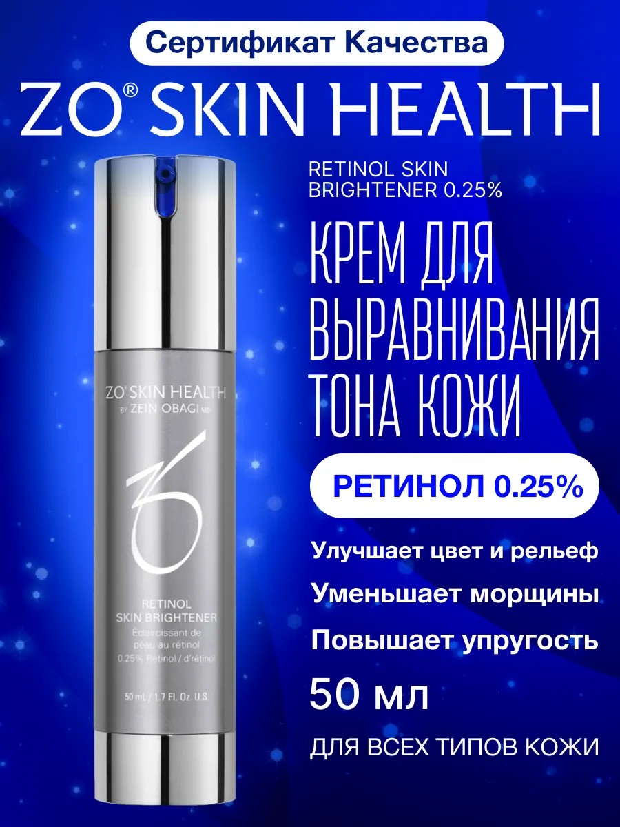 Try the unique innovative Retinol Skin Brightener 0.25% retinol ZO Skin Health by Zein Obagi, which will truly transform your skin! Retinol (also known as vitamin A) has truly unique properties – it is one of the most active cosmetic ingredients. Its molecules quickly penetrate the lipid barrier of the epidermis and rush deep into the skin, where they immediately begin their work: accelerating cell renewal and stimulating the synthesis of collagen and elastin. The result is noticeable skin rejuvenation: the tone and texture are improved and evened out; wrinkles are reduced; elasticity and density are increased. The unique formula of Zein Obagi retinol cream, containing 1% microencapsulated retinol, is designed for the effective treatment of hyperpigmentation. This cream ELIMINATES existing pigmentation, inhibits melanogenesis, promotes exfoliation and cellular renewal, smoothes microrelief, and evens skin tone. Youth, beauty, and tangible and visible health of your skin—we make all this available to you with the world-renowned premium American cosmetics ZO Skin Health, a recognized leader in professional cosmetology for over 30 years. We are the official importer of ZO Skin Health and have all the necessary permits and certificates to sell cosmetics in the Russian Federation. Discover a world of love and self-care with ZO Skin Health!