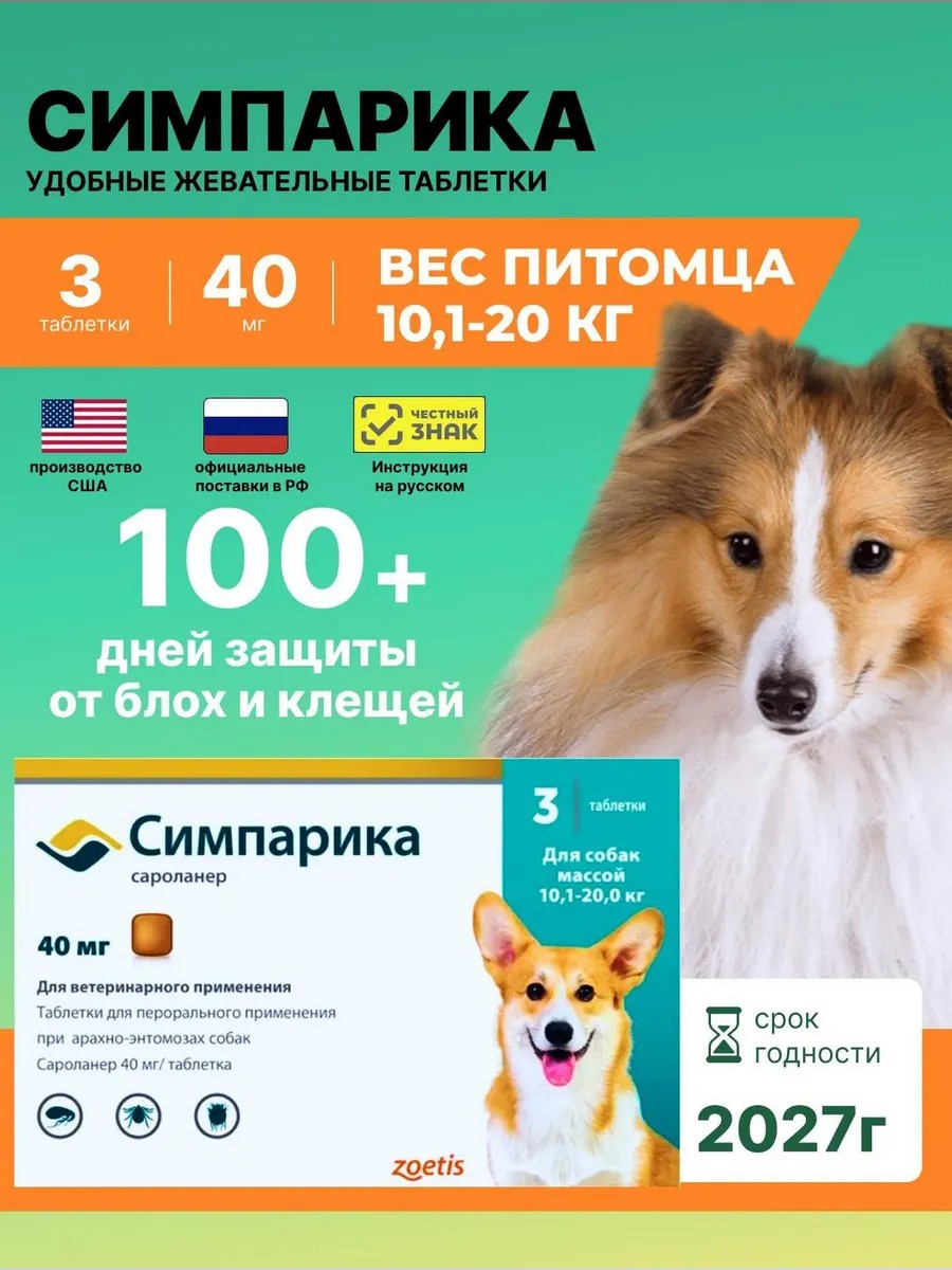 Симпарика, табл 40 мг (уп. 3 табл.) от 10-20 кг. Производство США для РФ. Срок годности до 2027г.