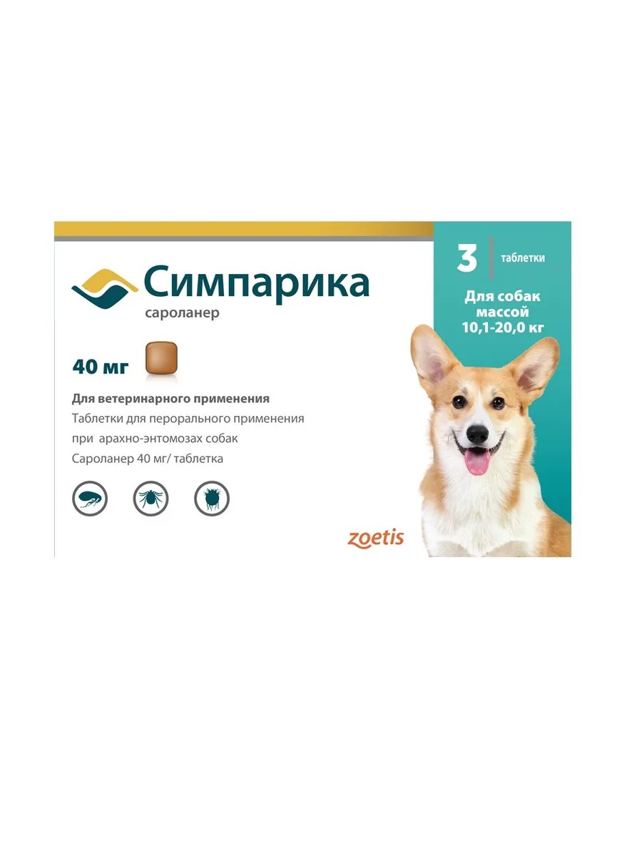 Zoetis 40мг от блох и клещей для собак 10,1-20кг 3 таб