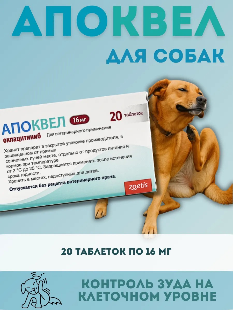 Апоквел применяют собакам перорально индивидуально с руки или в смеси с кормом, либо вводят принудительно в пасть в разовой дозе 0.4-0.6 мг оклацитиниба на 1 кг массы животного 2 раза/сут, не более 14 суток.