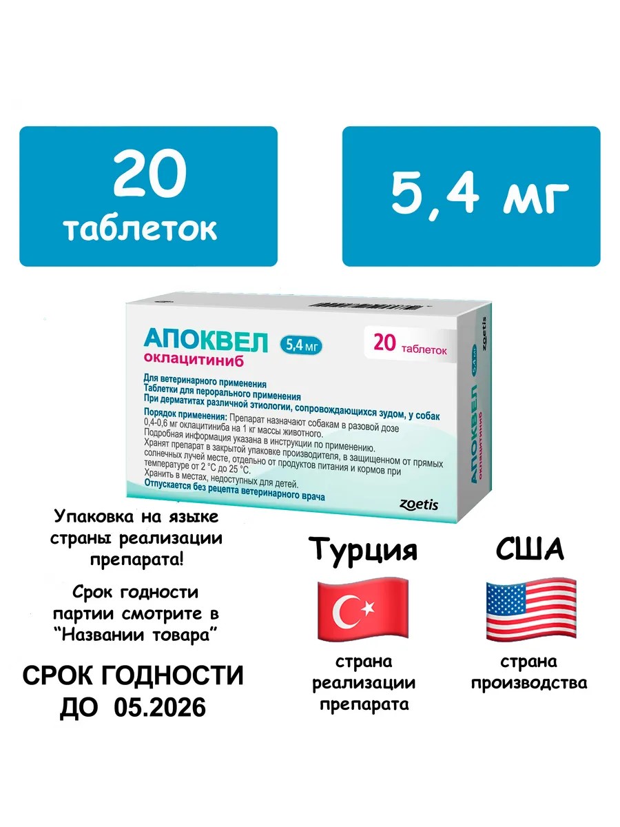 Апоквел 5,4мг 20таб.от аллергического зуда для собак и кошек