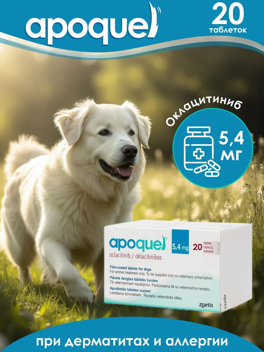 Препарат в таблетках для собак для контроля симптомов зуда и воспаления кожи при дерматите, ассоциированном с аллергией (контактной, пищевой, паразитарной), а также для лечения и профилактики рецидивов атопического дерматита.Апоквел назначают собакам при дерматите, ассоциированном с аллергией (контактный, пищевой, паразитарный) в целях устранения зуда и уменьшения очаговых изменений кожи, а также для профилактики рецидивов атопического дерматита.АПОКВЕЛ Противопоказанием к применению Апоквела является индивидуальная непереносимость животным его компонентов. Препарат выпускается в 3 дозировках: 3,6 мг/ 5,4мг/16мг.Дается животному согласно его веса. градация по весу указана в фотокарточке препарата.Годен до 09.2026