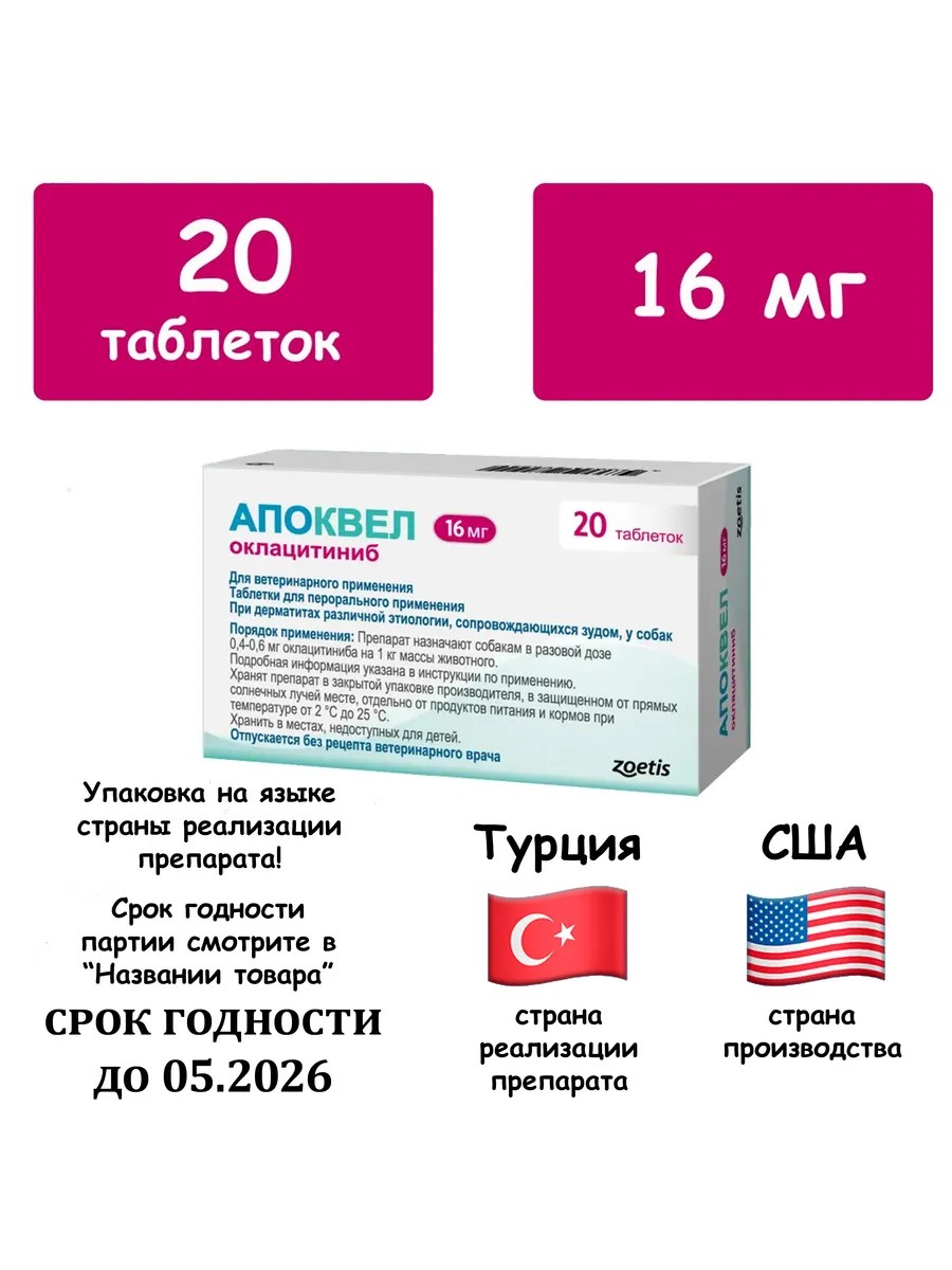 Апоквел 16мг 20таб.от аллергического зуда для собак и кошек