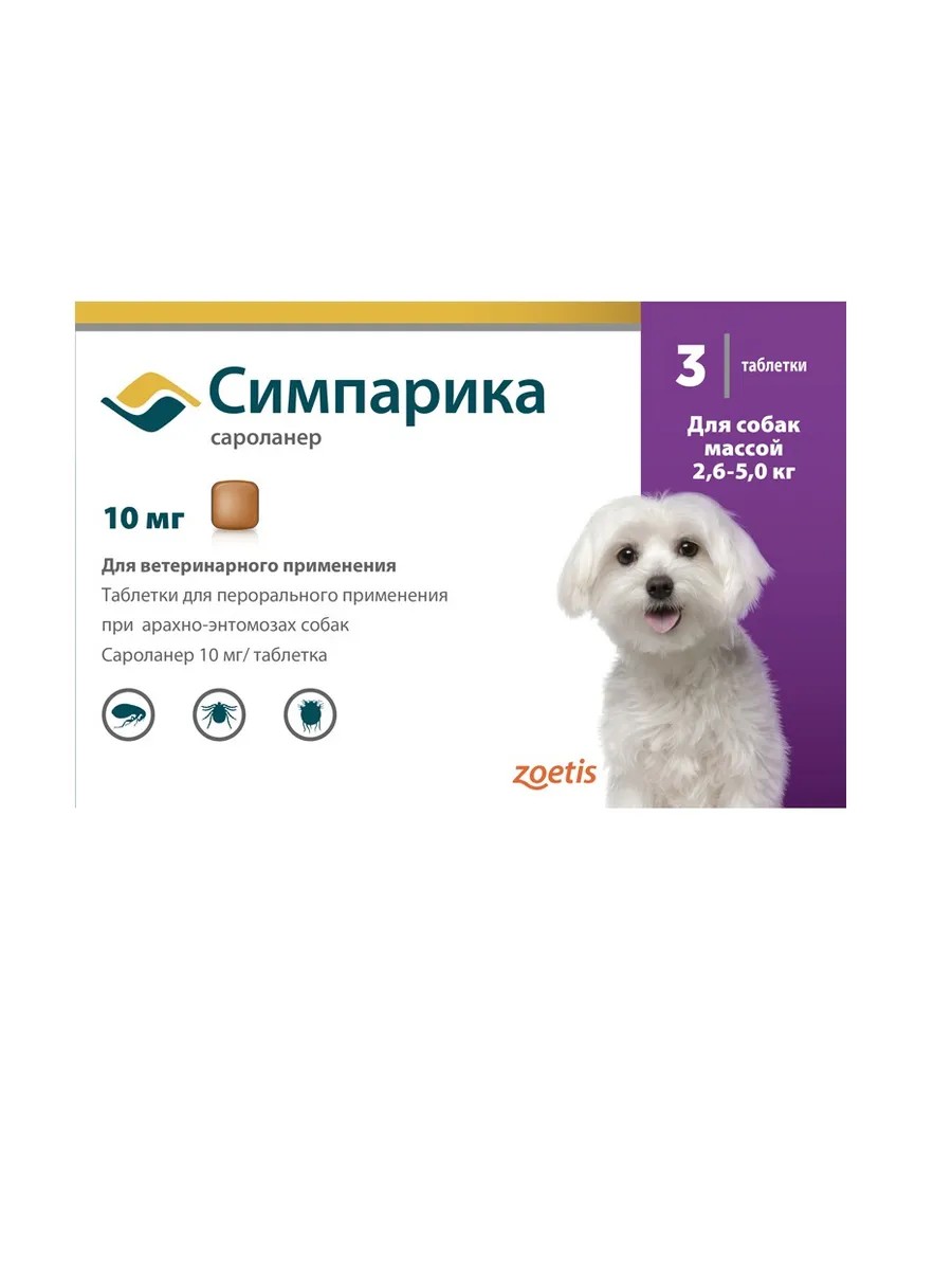 Zoetis CИМПAPИKA 10мг от блох и клещей для собак 2,6-5кг 3 таб
