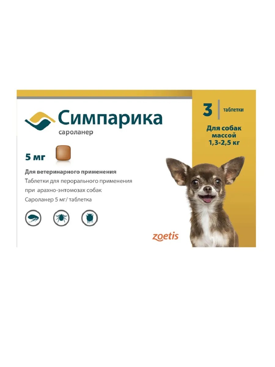 Zoetis CИМПAPИKA 5мг от блох и клещей для собак 1,3-2,5кг 3 таб
