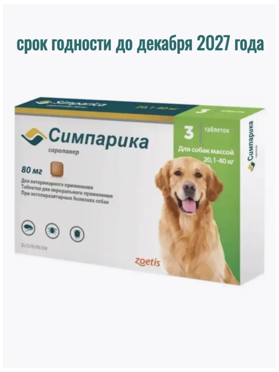 Жевательные таблетки Симпарика 80 мг для собак весом от 20,1 до 40 кг и возрастом от 8 недель.ПРЕПАРАТ ГОДЕН ДО 12.2027 года