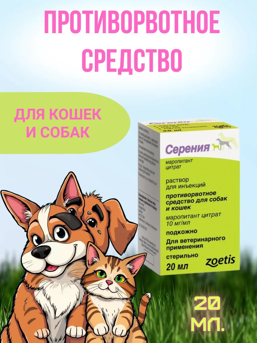 Серения относится к группе противорвотных средств.Действующее вещество Серении – маропитанта цитрат – является антагонистом нейрокининовых рецепторов (NK1) и ингибирует связывание субстанции Р, нейтропептида тахикининовой группы в ЦНС. Маропитанта цитрат эффективен при рвоте как центрального, так и периферического генеза. Маропитант быстро всасывается из места инъекции и достигает максимальной концентрации в плазме крови через 45 минут после введения. Маропитант более чем на 99% связывается с белками плазмы крови. Биодоступность Серении составляет 90%. Маропитант метаболизируется в печени цитохромом Р450, выделяется главным образом с фекалиями.По степени воздействия на организм маропитанта цитрат относится к умеренно опасным веществам (3 класс опасности по ГОСТ 12.1.007-76).