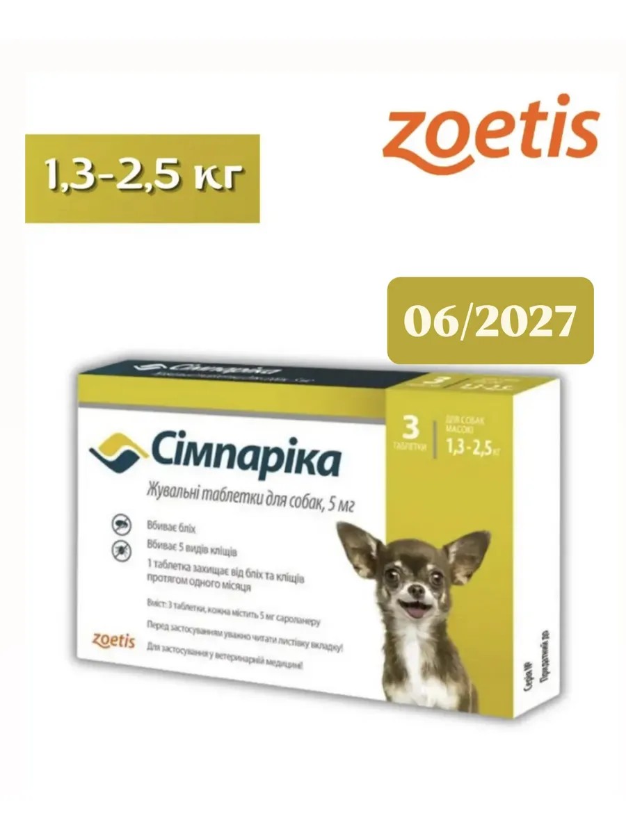 Zoetis Симпарика 1,3-2,5 кг для собак, таблетки от клещей, блох