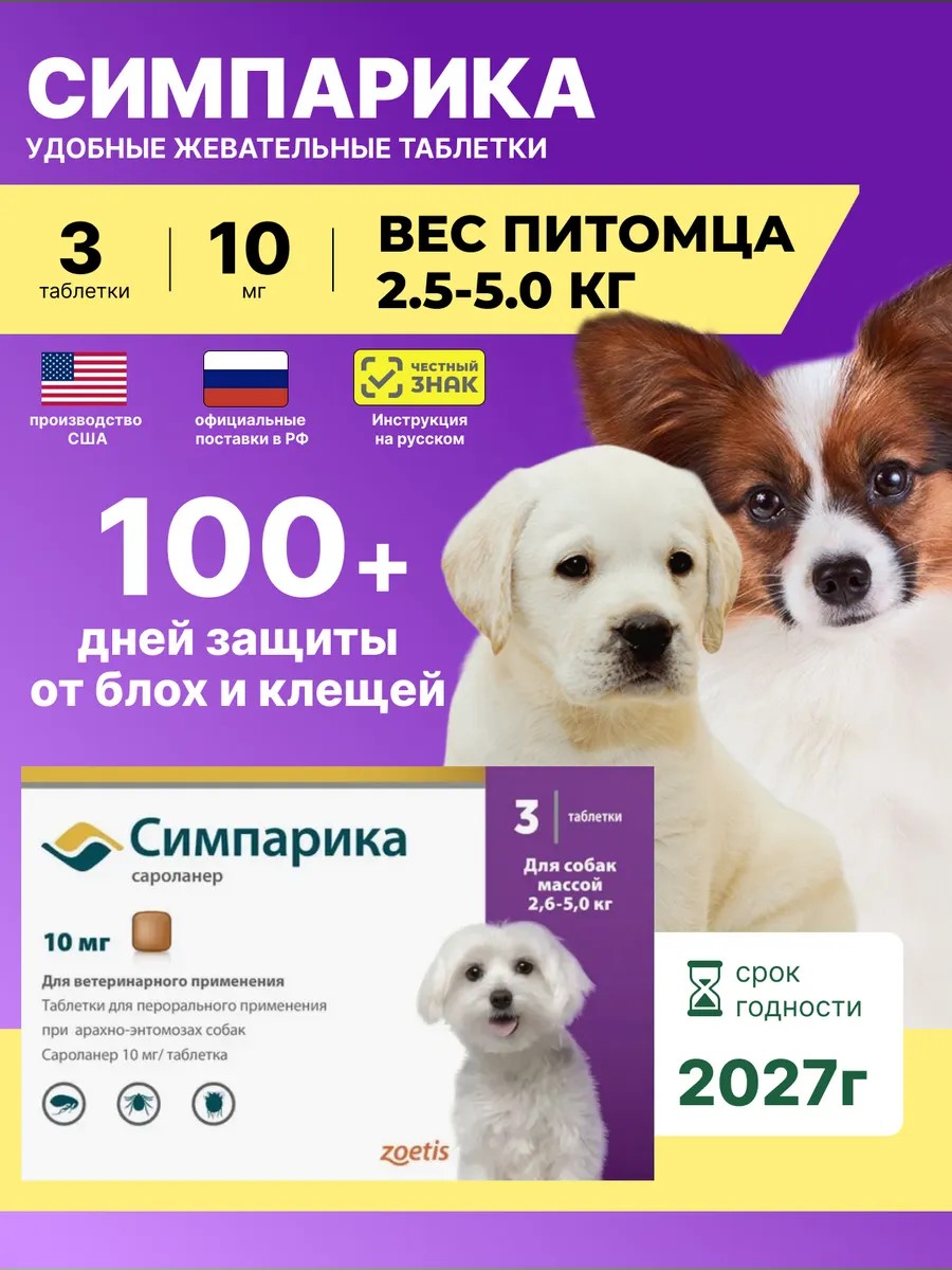 симпарика 10 мг против блох и клещей для собак весом от 2.6 до 5 кг 3 таблетки рекомендована для активных щенков (средних и крупных пород) и взрослых собак пород мини: Чихуахуа (2,5–3 кг); Йоркширский терьер (2,5–3,2 кг); Мальтийская болонка (3–4 кг); Померанский шпиц (2,5–3,5 кг); Папильон (3–5 кг); Той-пудель (3–4 кг); Ши-тцу (4–5 кг); Русский той (2,5–3 кг); Джек-рассел-терьер (мелкие особи, 4–5 кг); Норвич-терьер (4–5 кг)