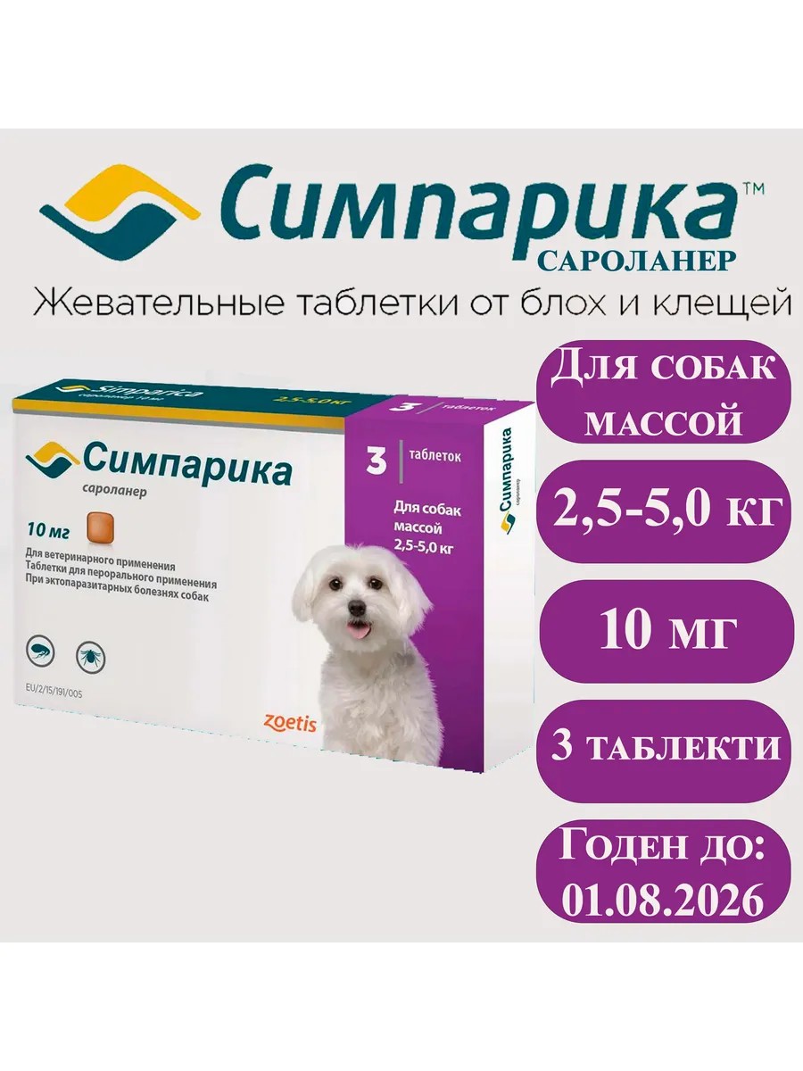 Симпарика 10 мг против блох и клещей для собак 2,5 до 5 кг