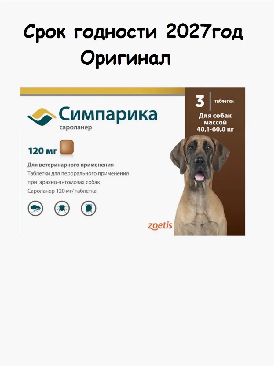Симпарика 120мг от блох и клещей для собак 40,1-60кг 3таблет