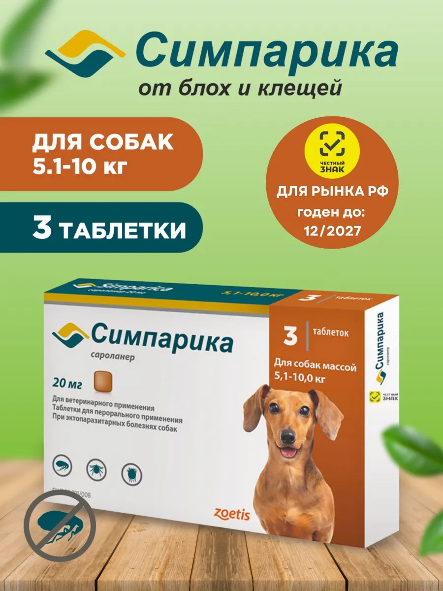 Zoetis Симпарика 20 мг, 5,1-10 кг, таблетки для собак, 3 шт в уп