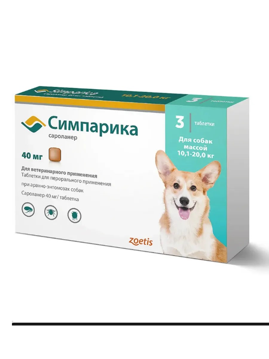 Симпарика 40 мг от блох и клещей для собак 10-20кг