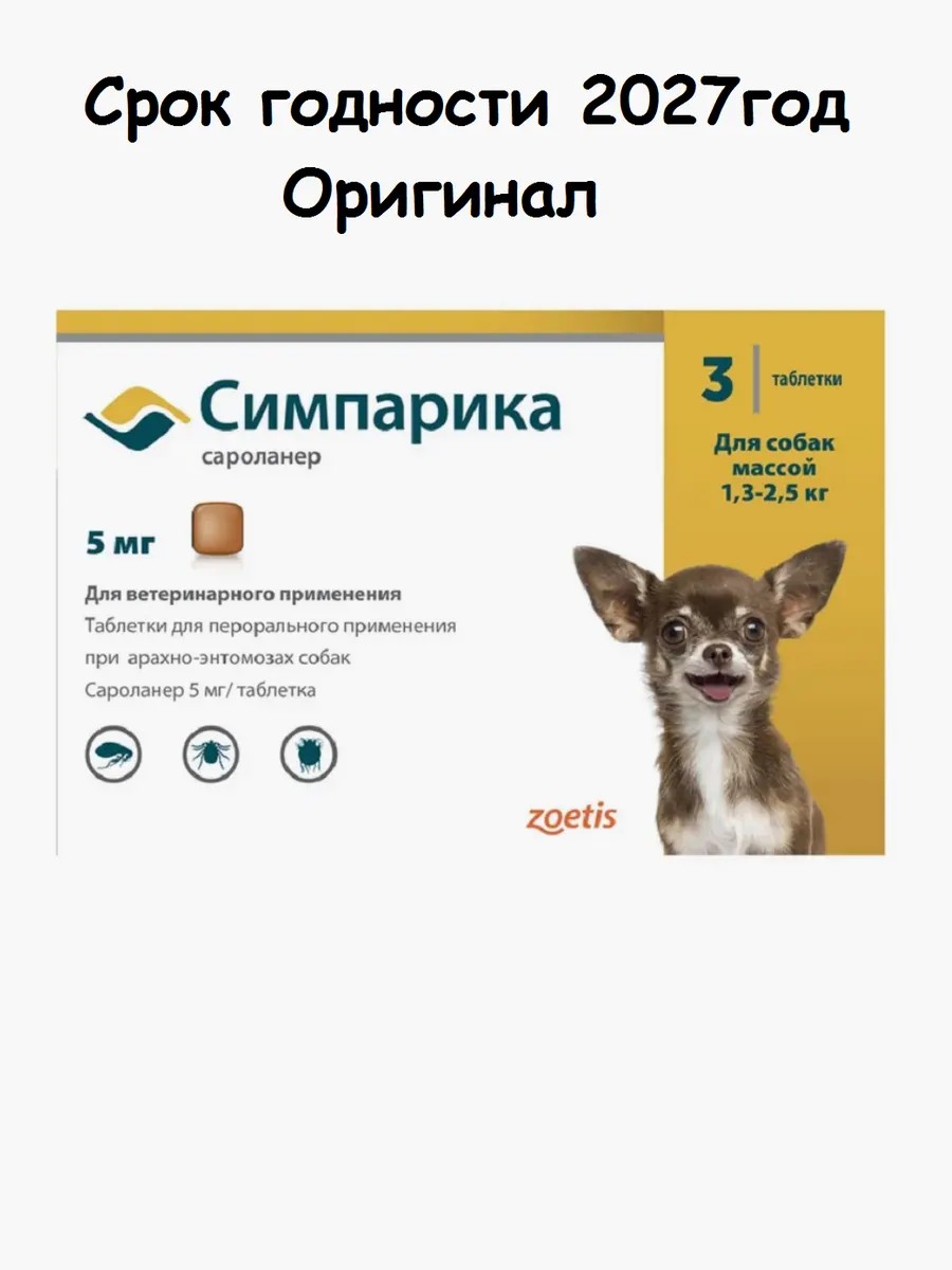 Zoetis Симпарика 5мг от блох и клещей для собак 1,3-2,5кг 3таблетки