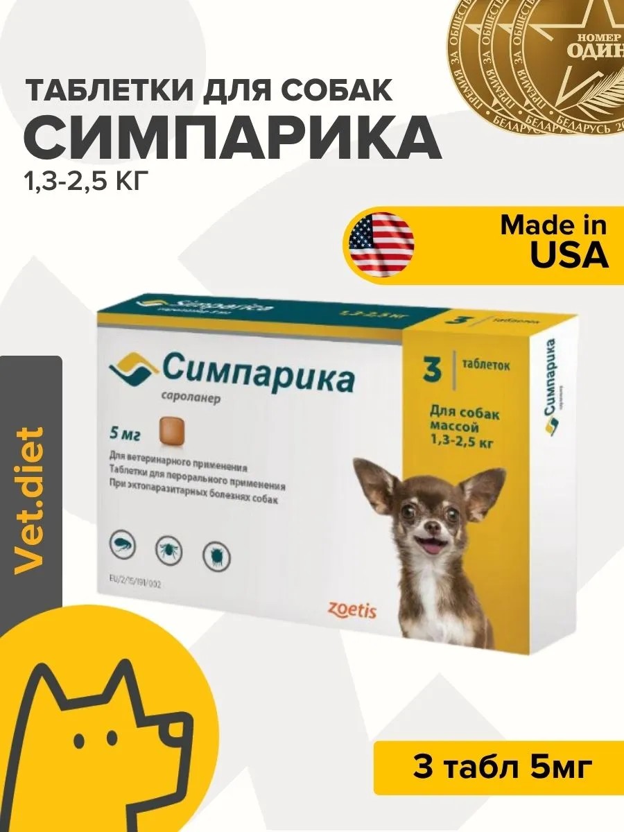 Позаботьтесь о здоровье и комфорте вашего маленького питомца с таблетками "Симпарика" Zoetis! Этот инновационный препарат разработан специально для собак весом от 1,3 до 2,5 кг и обеспечивает надежную защиту от блох и клещей на протяжении 5 недель.