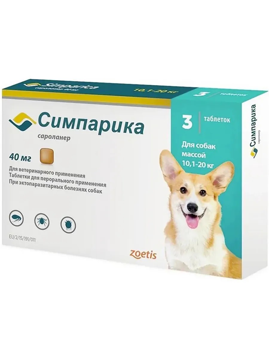 Симпарика для собак 10-20 кг, от блох и клещей, 40 мг, 3 таб