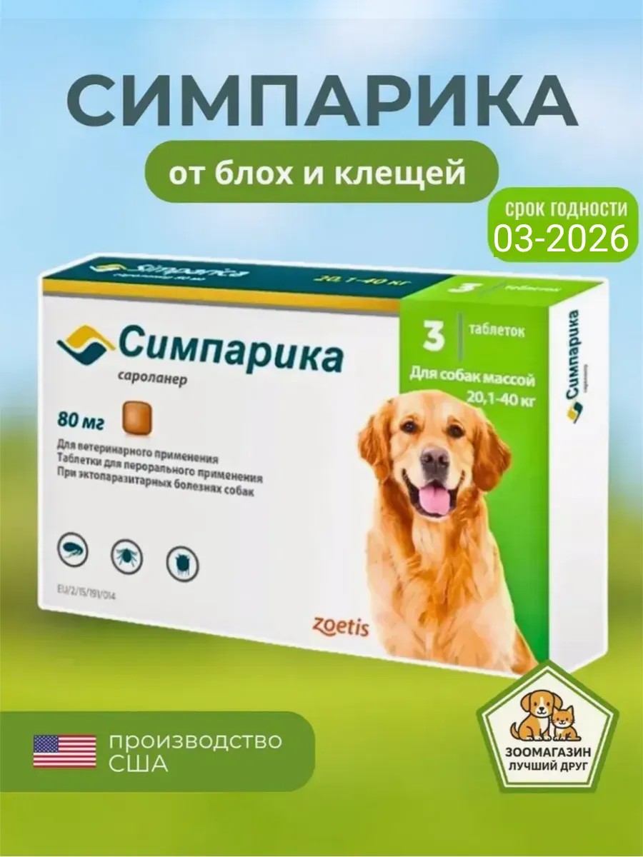 Симпарика 80 мг — оригинальные жевательные таблетки от Zoetis (США) для защиты собак весом 20–40 кг от блох и клещей. Эффективное средство действует через 3–4 часа, обеспечивает защиту на 35 дней после приёма одной таблетки. Подходит собакам от 8 недель. Упаковка содержит 3 таблетки.