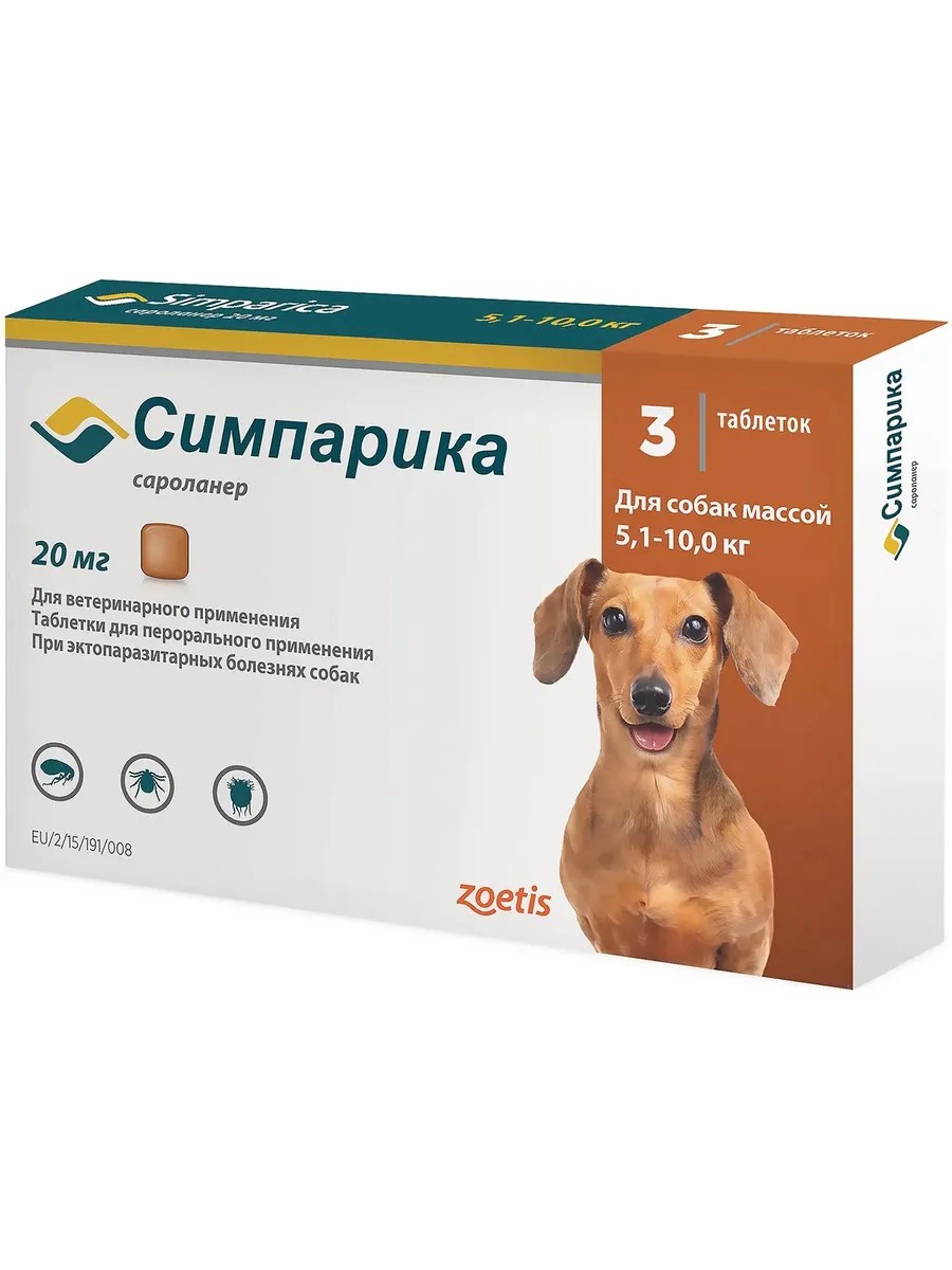 Симпарика для собак 5,1-10 кг, от блох, 20 мг, 3 таблетки