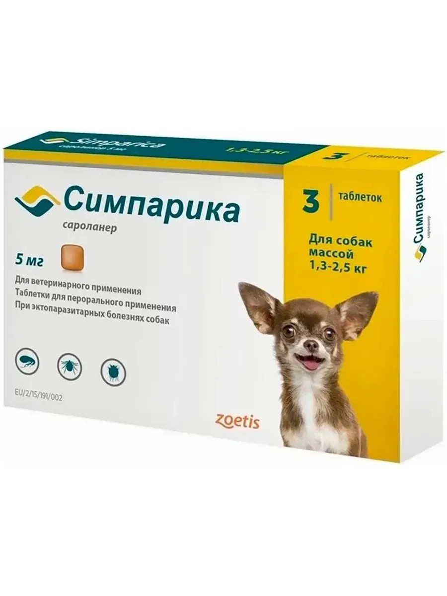 Препарат Zoetis Симпарика представляет собой жевательные таблетки для защиты собак от блох и клещей. Данное средство относится к группе изоксазолинов и предназначено для взрослых собак весом от 1,3 до 2,5 кг. В упаковке содержится 3 таблетки по 5 мг действующего вещества сароланер.