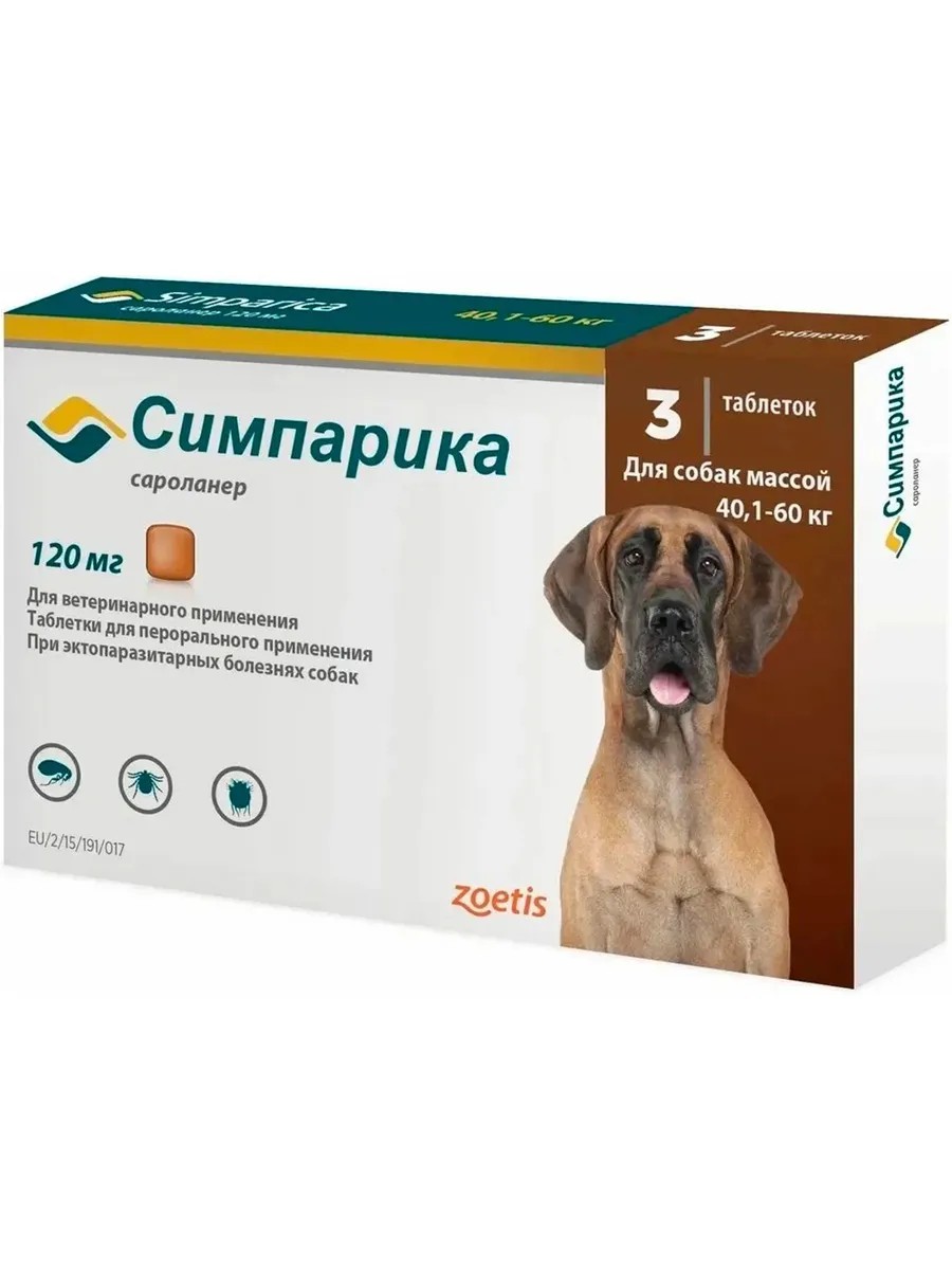 Препарат Симпарика от компании Zoetis представляет собой жевательные таблетки для лечения и профилактики заражения блохами и клещами у взрослых собак весом от 40 до 60 кг. Данное средство относится к безрецептурным препаратам и доступно для свободной продажи.