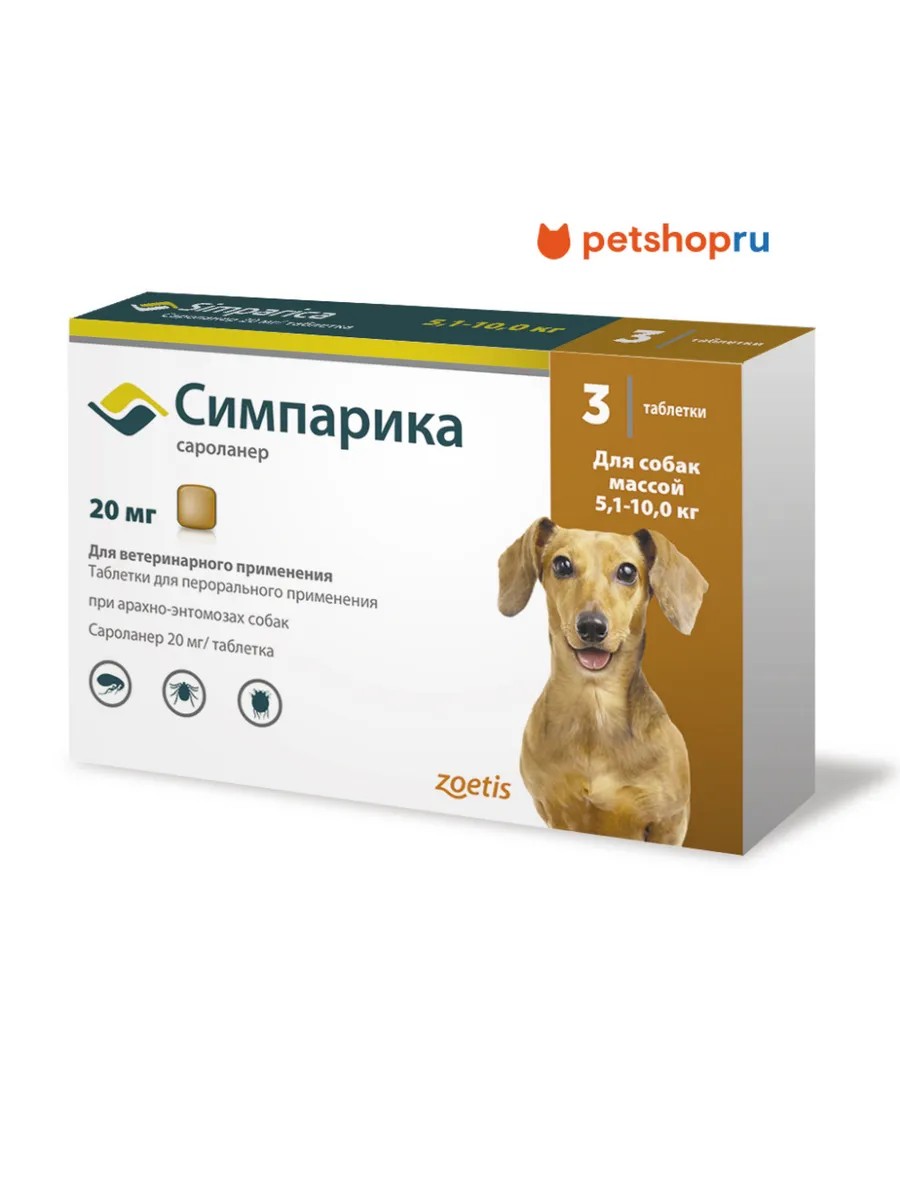 Симпарика, от блох и клещей для собак 5.1-10 кг, 3 таблетки