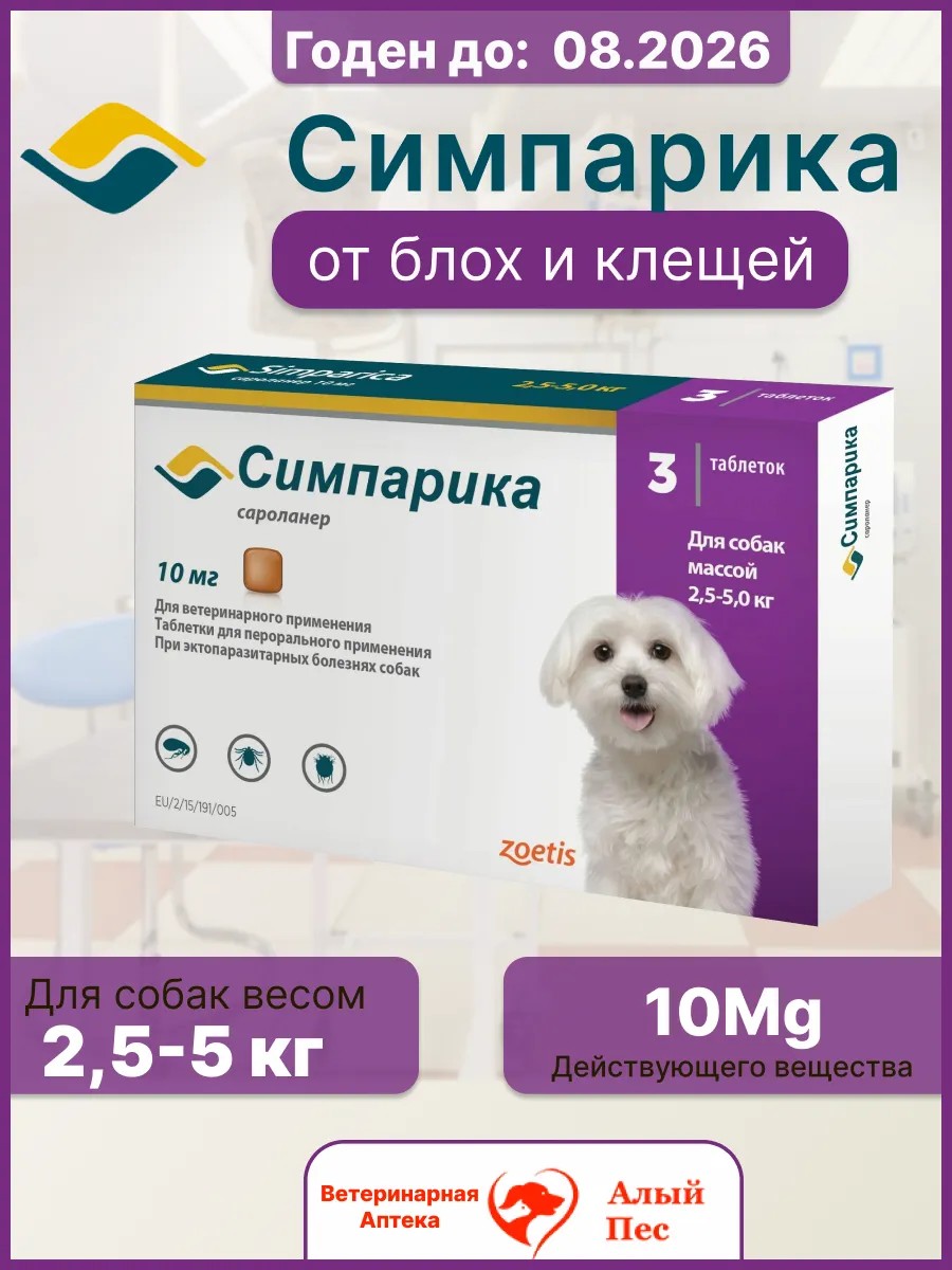 Таблетки от блох и клещей Симпарика 2.5 до 5 кг в упаковке 3 таблетки. Препарат от блох и клещей для собак весом 2.5 до 5 кг. Одной таблетки лекарства от блох и клещей хватит на 1 месяц защиты вашего питомца. В одной упаковке 3 таблетки. Симпарику назначают собакам для лечения и профилактики энтомозов, вызываемых блохами (Ctenocephalides felis, Ctenocephalides canis ), акарозов, вызываемых иксодовыми (Dermacentor reticulatus, Dermacentor variabilis, Ixodes hexagonus, Ixodes holocyclus, Ixodes ricinus, Ixodes scapularis, Rhipicephalus sanguineus, Amblyomma americanum, Amblyomma maculatum), саркоптоидными (Sarcoptes scabiei), псороптоидными (Otodectes cynotis) и демодекозными (Demodex canis) клещами.