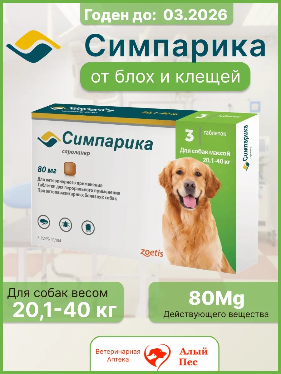 Таблетки от блох и клещей Симпарика 20 до 40 кг в упаковке 3 таблетки. Препарат от блох и клещей для собак весом 20 до 40 кг. Одной таблетки лекарства от блох и клещей хватит на 1 месяц защиты вашего питомца. В одной упаковке 3 таблетки. Симпарику назначают собакам для лечения и профилактики энтомозов, вызываемых блохами (Ctenocephalides felis, Ctenocephalides canis ), акарозов, вызываемых иксодовыми (Dermacentor reticulatus, Dermacentor variabilis, Ixodes hexagonus, Ixodes holocyclus, Ixodes ricinus, Ixodes scapularis, Rhipicephalus sanguineus, Amblyomma americanum, Amblyomma maculatum), саркоптоидными (Sarcoptes scabiei), псороптоидными (Otodectes cynotis) и демодекозными (Demodex canis) клещами.