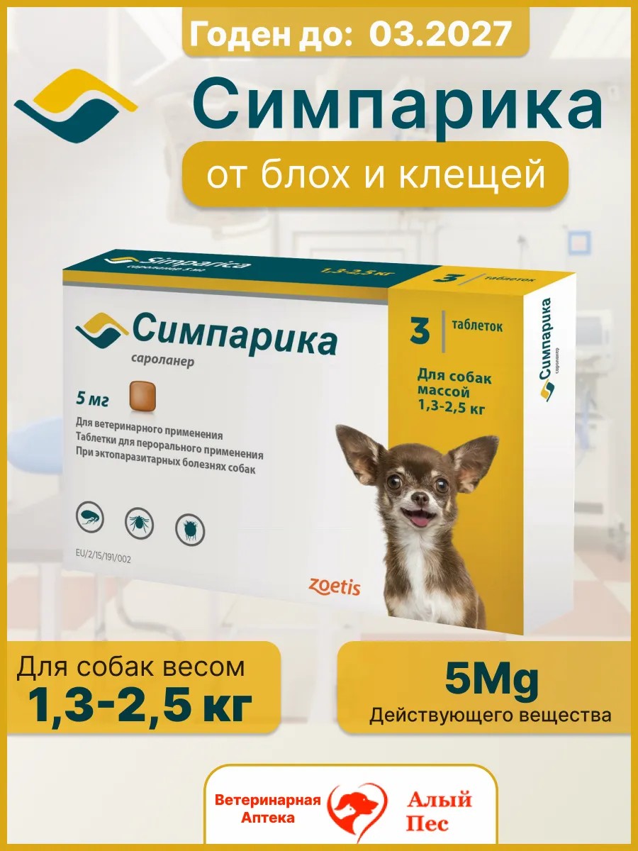 Таблетки от блох и клещей Симпарика 1.3 до 2.5 кг в упаковке 3 таблетки. Препарат от блох и клещей для собак весом 1.3 до 2.5 кг. Одной таблетки лекарства от блох и клещей хватит на 1 месяц защиты вашего питомца. В одной упаковке 3 таблетки. Симпарику назначают собакам для лечения и профилактики энтомозов, вызываемых блохами (Ctenocephalides felis, Ctenocephalides canis ), акарозов, вызываемых иксодовыми (Dermacentor reticulatus, Dermacentor variabilis, Ixodes hexagonus, Ixodes holocyclus, Ixodes ricinus, Ixodes scapularis, Rhipicephalus sanguineus, Amblyomma americanum, Amblyomma maculatum), саркоптоидными (Sarcoptes scabiei), псороптоидными (Otodectes cynotis) и демодекозными (Demodex canis) клещами.