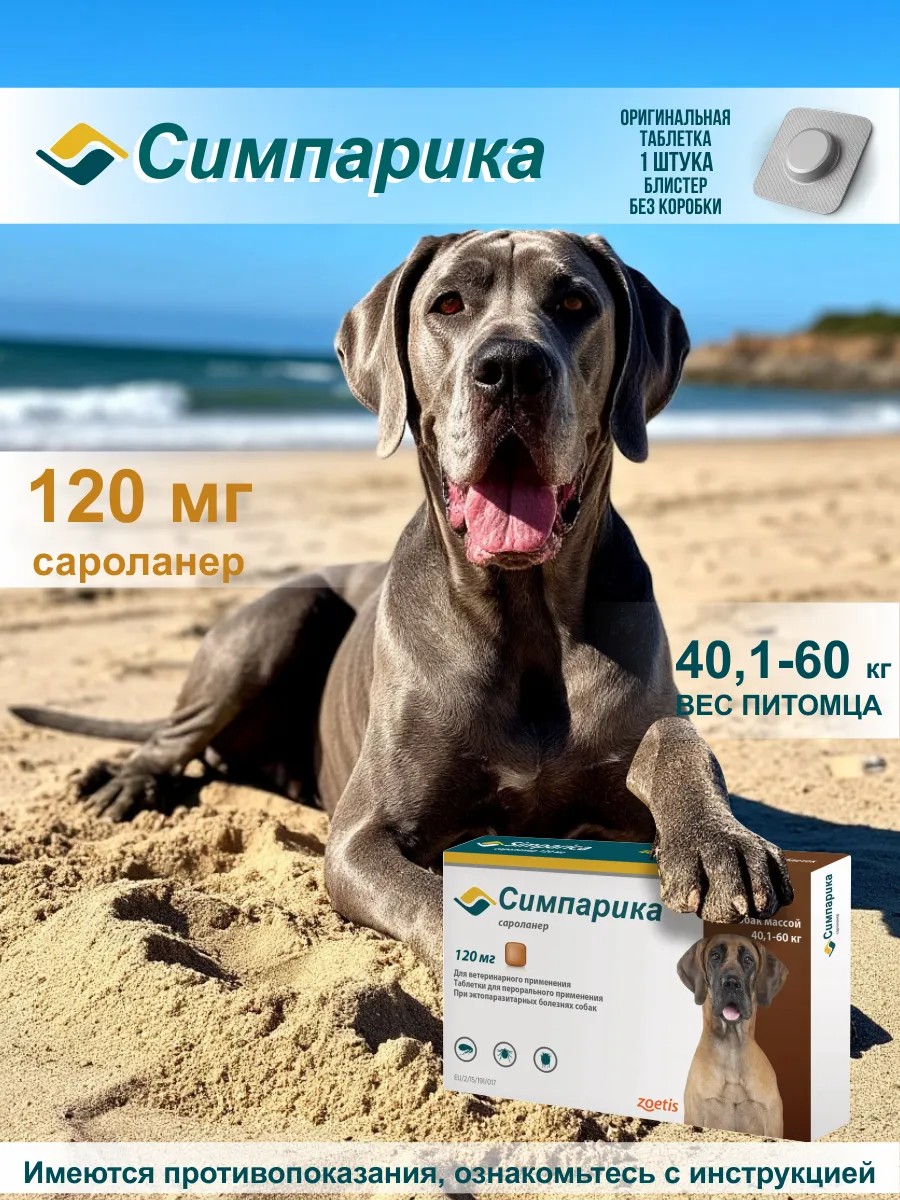 Симпарика для собак 40-60 кг. Препарат начинает действовать через 4 часа после применения и вызывает гибель блох через 8 часов после прикрепления к организму хозяина, клещей — через 12 часов, предотвращая повторную инфестацию собак эктопаразитами. Гибель блох происходит до откладки яиц, что профилактирует контаминацию помещений яйцами и личинками. Симпарика по степени воздействия на организм относится к веществам «малоопасным» (4 класс опасности по ГОСТ 12.1.007-76), в рекомендуемых дозах не оказывает эмбриотоксического, тератогенного, мутагенного действия. Симпарика назначают собакам для лечения и профилактики афаниптероза, в комплексной терапии вызываемого блохами аллергического дерматита, акарозов, вызываемых иксодовыми клещами, для лечения демодекоза, саркоптоза и отодектоза, а также для снижения риска бабезиоза.