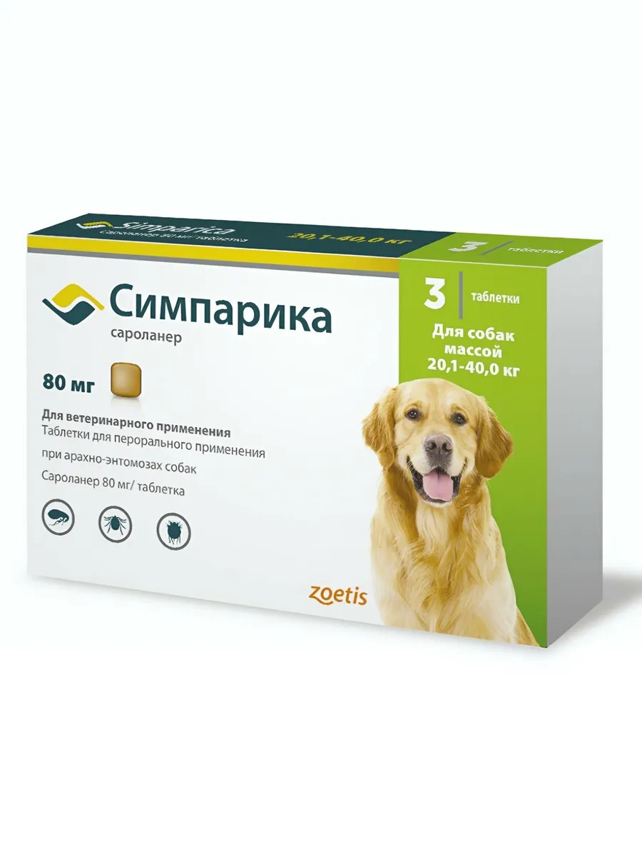 | Полное наименование товара | Симпарика (Simparica) 80 мг против блох и клещей для собак весом от 20,1до 40,0 кг |