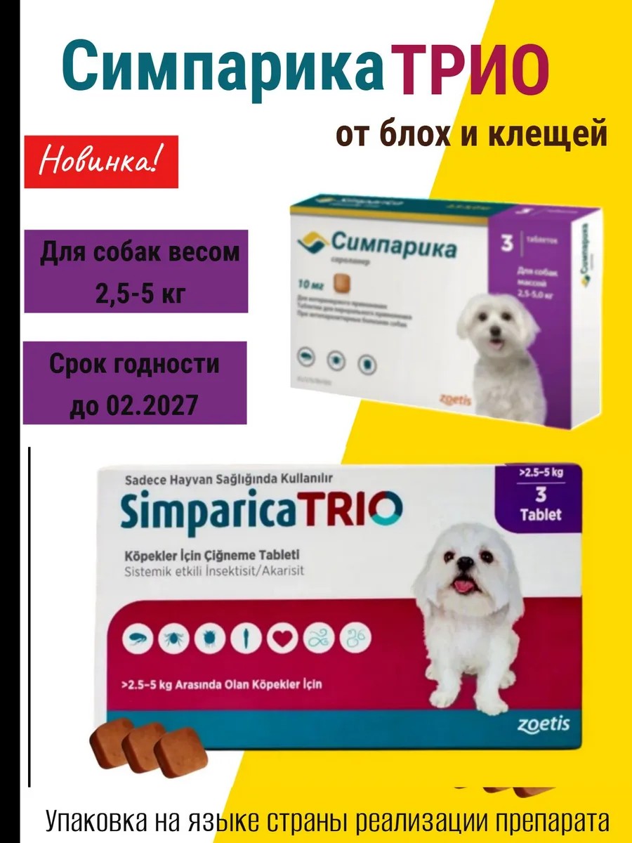 Симпарика трио таблетки от блох и клещей весом от 2.5 - 5 кг